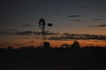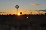 We took the opportunity to use the town dump point & while filling with water another Kimberley Karavan pulled in next to us. We chatted for around an hour, exchanged different camp site information, places to see & to go, also discussed some of the differences we had between our Karavans. A bite of lunch (only 2 places to eat, the pub or the road house – we were not adventurous enough for the pub) they have a Centrelink Office, the Post office is the grocery store as well ( it is a good idea all post offices should sell groceries, they are selling everything else) the museum and not much else. Then on the road again and it was just 2 pm as we crossed from Queensland over the imaginary boarder to the Northern Territory and there it was only 1.30 pm in the Northern Territory. Another noticeable change, the speed limit is 130. The roadside scenery changed as we moved further into the Northern Territory, the ground became richer red colour & the low shrubs greener. 322kms later we pulled into the Frewena rest area on the Barkly Highway about half an hour before sunset. Coffee, fruit cake, cheese & a nice walk, then we enjoyed a beautiful outback sunset with an old Southern Cross windmill as a backdrop.