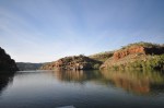 Into the purpose built cruise boat with twin 350hp V8 Yamaha outboards for the 55km trip back down the river. Our boat driver, Grant was very informative and a good helmsman. We had a lot of stops on the way down to look at the wildlife. We saw a lot of freshwater crocodiles & a large number of different bird species. The views of the mountains & valleys was again a highlight with the colours changing with the light as we moved downstream. We stopped for a great afternoon tea lovely pumpkin scones, carrot cake, fruit, juice, coffee & tea at a JJJ Tours camp on the riverbank before heading downstream once more. The tour boat sat very comfortably at 50km/hr with over 40 people on board. We stopped a few more times to look at wildlife, including some amazing birds called Jacanas that appear to walk on water.