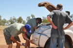 Tereza & I were up before sunrise yet again & saw another great sunrise with the birdlife becoming active. We had a leisurely breakfast of bacon & eggs before packing & on our way again. There were a few creek crossings on the way out, which John filmed, then we were regaled by the splendour of the Leopold Ranges as we continued our journey westward across the Gibb River Road. We stopped at a couple of lookouts on the top of some ranges & appreciated the stunning scenery. John had to stop & do some running repairs to his car, the front bumper on the Toyota Prado is very close to falling off as most of the plastic brackets have broken, so, it was out with the duct tape & Sue did an impressive strapping job to the front bumper, now with silver stripes. Just before the turnoff to Windjana Gorge we stopped at a tiny snack stop, (this is in the middle of nowhere) a lonely caravan a couple of hundred metres in, run by an elderly man on the banks of the Leopold River, he was obviously a keen bird watcher as he had a couple of spotting scopes set up. We bought some ice creams & drinks & turned onto the Leopold Downs Road for the 20km trip to Windjana Gorge. People think that John & I are brothers, they reckon we look so alike (Tereza says brothers from another mother).