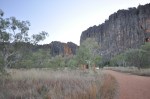 We got up with the birds this morning, wolfed down breakfast & we were inside the track to Windjana Gorge just as the sun was rising. With John & Sue, we were the first ones out enjoying the tranquillity & beauty of it all. No, we haven’t been bird, gorge, big rock or water holed out yet. This is a completely different gorge, the rocks are limestone made of corals about 360 million years old. It’s something like out of middle earth. We enjoyed every step of the 3 km way, watching the birds, bats & the crocodiles. We saw around a dozen crocodiles in the shallow water, goodness knows how many more we didn’t see – we didn’t tempt fate by having a swim. A few of the larger crocodiles were waiting patiently under the bats waiting for one to drop into the water. A special treat was sighting a mating pair of grey goshawks, this is only the second time I have seen one, the last in Canberra around 15 years ago.