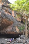 On our return to the camp it was time to pack up. We travelled 35 km to Tunnel Creek. The sun was beating down, luckily we only had a short walk before the entrance. Great big boulders to climb over & through – wow, what an amazing entrance into this unreal cave. The walk is easy after the initial entrance – sand & wading through water up to your belly button if you are me or not getting your bottom wet if you are Ron, 6’2” tall. We used our head lamps as it is pitch black up to about half way, a break through the cliff & back to dark until the end, 1 ½ km return trip. The cave runs from one side of the Napier Range to the other & in the 1890s was used as a hideout for Jandamarra, an aboriginal freedom fighter until he was killed there. The cave had a lot of fruit bats in it & wonderful ghost bats, tiny catfish, freshwater prawns & on our return Ron noticed some shiny reflection, on closer inspection crocodile eyes. The ceiling was formed through millions of years of water erosion & formed some giant stalactites.