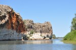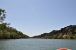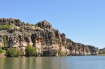 A leisurely start this morning, we didn’t get up until sunrise as the Geikie Gorge boat cruise we wanted to be on was the 9.30am one. Spent a bit of time doing some maintenance on the Karavan, then took the scenic route via the old, low, single lane Fitzroy Crossing bridge out the 21km to Geikie Gorge. Bitumen most of the way – a pleasant change. The one hour boat cruise is in large flat bottomed aluminium boats designed to hold loads of pensioners (just like us really). The Geikie Gorge is very pretty, rather than spectacular, with a lot of water held in it. The flood level is amazing. In the gazebo where the bookings are taken the flood levels are shown on the ceiling & the gazebo is a long way above the normal water level. A couple of recent floods were way over the roof & 15km wide. The water flow in flood is 30,000 cubic metres per second. (If Sydney Harbour would be empty it would fill it in 5 hours).