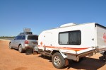 After around 450 km of driving we finally turned off into the World Heritage Area of Shark Bay & the road to Denham & Monkey Mia. The desert scenery was now broken by glimpses of the waters of Shark Bay & the views across the bays & headlands. We saw a few more wild animals, one of the emus we saw was sauntering along the side of the road seemingly oblivious to us (almost oblivious to me too, I barely had time to take a photo of it). We also saw a lazy goanna crossing the road & some magnificent wedge tailed eagles soaring. We finally reached the township of Denham, located right on Shark Bay & we booked into the Shark Bay Caravan Park. We had a very long drive today, a total of 585km & feeling a little weary.