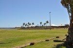 This morning we crossed the Tropic of Capricorn again, heading south from Coral Bay – a bit sad really as it means we are now out of the tropics & heading home. The desert & red sand dunes on either side of the road is livened up a bit now & again with carpets of white, pink & yellow wildflowers flowering after a recent rain. Four hours of fairly boring driving through the desert we came to the town of Carnarvon, a little oasis of organic farm stalls where we stopped to buy some fruit & vegetables as we haven’t been anywhere for a while where we could shop for fresh food. At Carnarvon we were greeted by a fabulous multi-coloured bougainvillea display. We also popped into Woolworths for some other groceries then drove to the harbour & had our lunch. There were a few nice boats moored there & on the other side is obviously where the wealthy people of Carnarvon live, very nice new houses on a new waterfront sub-division.