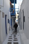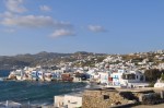 A very late start today, 9.15am departure for the Athens port of Piraeus. We boarded the ship, the Louis Majesty, around 10am & found our little two bed (instead of the big party beds, king size beds we had in the hotels) cabin on deck 4. We explored the ship until casting off at 10.30, then lifeboat drill, a briefing by Anne, our tour director for the cruise, then lunch at 1.15pm. The voyage to Mykonos was very windy, the ship was ploughing up & down through the waves & the strength of the wind had the ship sailing with a noticeable lean. We sat on the back sundeck, out of the wind as much as possible, warming ourselves in the occasional sun shine & watched the islands pass by. For most of the time we had the entire sundeck to ourselves, it was that windy (we were rugged up in our wind jackets, we looked like we were going to Antarctica, not cruising around the beautiful sunny Greek Islands). We arrived at Mykonos a shade after 5pm & disembarked for the short bus trip into Mykonos & a walk around town. All of the houses are whitewashed & most have blue window & door paint, there are a few rebels making a statement with a red, yellow or green window colour here & there.