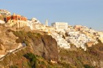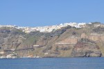 We lunched onboard on the way to Santorini & I had a brief sleep before we ventured out on the top deck to watch Santorini come into view. We quickly raced downstairs again to get our coats as it was very cool outside. Santorini suffered a massive volcanic eruption around 1450 BC that destroyed the existing towns & left the island completely changed (there is a belief that Atlantis was the sunken city as records describe a very similar region). The ship motored into the massive flooded caldera of the volcano & stopped without anchoring, at 400 metres it is too deep to drop anchor, then the tender boats came out to take us ashore. The imposing steep cliff sides of the volcano dominate the harbour, with a sprinkling of white houses dusting the rim of the caldera. One of the islands in the middle of the harbour is the cone of the still active volcano, still steaming & smoking, rising from the sea 500 years ago. We disembarked at the tiny port of Athinios at the base of the massive cliff & then the bus zigzagged slowly up the long climb to the rim. It is so high up, the photos don’t give a real perspective on how high it really is.