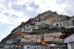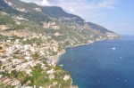 The Grand Hotel La Pace is absolutely beautiful, 1950’s style, marble floors (including a beautiful blue marble in the entrance), art nouveau chandeliers, huge rooms, marble bathroom, marble floored bedroom, inlaid wooden furniture everywhere. A quick break then onto a smaller bus & off to Positano & the Amalfi coast. The drive to nearby Positano is both breathtaking & scary, clinging to the cliff face, switching back & forth, climbing higher all the time, before descending into the town & bus parking area – I’m glad Luigi & not me is driving the bus. We walked down the narrow twisting cobblestone footpaths towards the beach area, passing lots of clothes shops, some high end art places, a few pottery places & the odd cafe. We passed the old church where an American couple were having their wedding photos taken before passing through a very narrow alley to the stony beach. A few boats pulled up on the beach & a few anchored offshore. What sand there is, is black, mostly stones & pebbles, no waves – terribly uninviting – yet people go there (the rich & famous). We met up with a few of our group on the beach & had a quick chat, then walked slowly back up the hill, checking out some things in a few shops before rejoining our little bus at the parking garage. I noticed a roadway built out from the sheer cliff high above & said out loud, “I’m glad we don’t have to drive on that” – well, that was the road out. The same exhilarating drive back – these Italian drivers are crazy, overtaking anyone anywhere, scooters are mayhem, they do anything they like, anytime, anywhere – & all this with a 500 foot drop on one side plus the road is barely wide enough for two cars to pass, let alone a bus. Anyway, we made it back safely in time for a quick change, then dinner time.
