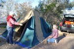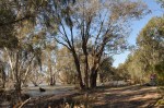 We called in to the place we planned to camp, Emu Lake, but Tereza was very unimpressed – there were a few emus there though. We went on the next 500 metres to Kinchega Woolshed & the National Park Visitor Centre. The Kinchega woolshed is very large, again made from local cypress pine, but only half the size now of what it was in its heyday. A very interesting walk through as it was left largely as it was when finally abandoned as a working concern in 1967 when the ceremonious 6 millionth sheep was shorn in it to mark the handing over of the property to the National Parks. While sitting on a bench in the shade of the old shearer’s quarters, we looked up & saw Helen & John Miller, our friends from Canberra arrive, whom we were going to camp a couple of nights with at Emu Lake. As Emu Lake (dry saltbush only, no water) did not look particularly attractive (not one person was camped there, for obvious reasons), we decided to head off to try & find a camp where the helpful bloke at the Menindee Information Centre suggested was a good free camp, along the edge of Lake Pamamaroo.