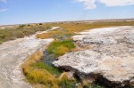 The Oodnadatta Track continued to follow the old rail line with the old rail bridges still standing crossing over dry creek beds, the odd water tank standing lonely waiting for non-existent steam trains & the old railway siding stone buildings, fallen into ruin. We crossed the dog-fence, an extremely long wire fence stretching across a vast stretch of Australia, designed to keep the dingoes out of sheep country. We passed a sculpture park, were the owner does crazy things, such as plant the tails of two planes in the ground & call it art. The landscape then changed to low sand hills, interspersed with salt plains between them before we came to a lookout for viewing Lake Eyre South. This lookout is at around the closest point that the lake gets to the road & it is unbelievable that the lake is 15.7 metres below sea level. We read all the interesting information on the display boards, then kept on going to Wabma Kadarbu Mound Springs.