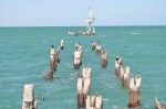 The wind was blowing strongly through the treetops as we left Mambray Creek this morning, a few people were out chasing photos of the group of emus that feed around the camp ground. We drove the short distance to Port Germein, being buffeted by very strong winds, before parking across the road from the old tram depot. We rugged up, put our coats on & started on the walk to the end of the longest wooden jetty in Australia, all 1,532 metres of it. What amazed us was the young kids in bare feet & lightly dressed walking back off the jetty – they must be locals. Towards the end of the jetty there were a few locals tending their crab nets, ropes tied to the jetty with a baited crab net & hoping to catch a feed of blue swimmer crabs. They all had varying degrees of success, with most catching enough for a feed. The crab fishermen had all sorts of ways of taking all their gear out the length of the jetty, an old pram, a fridge trolley, a 4 wheel trolley, all to make life a bit easier on the long walk out & back as apparently the crabs can only be found out near the end of the jetty.