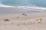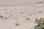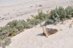 There were light showers passing through as we packed this morning & departed Kingscote. Our first destination was Seal Bay, aptly, to see the seals, or more correctly, the Australian Sea-Lion. We paid our fee to the National Parks people to use the boardwalk down to the beach & the viewing platform as we decided we didn’t need the guided tour & walk on the beach with the seals. We were in luck, bumping into Libby again returning from viewing the seals, the rain showers had eased & we had the viewing platform all to ourselves for a long time. There were lots of seals lying on the beach & in the sand dunes sunning themselves, the young seal pups waiting for their mothers to return. The males are very large animals, weighing up to 200kg, they are certainly formidable looking up close. We enjoyed watching all of the interactions between the seals as they moved around, playing in the water, asserting authority over another, feeding the young pups. We could have stayed watching them for hours, but we noticed a large rain squall coming so decided to walk back up to the shelter of the information centre. There was also a large whale skeleton laying in the dunes.