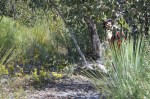A little bit of rain overnight – showery stuff with the air a bit cooler this morning, threatening to shower again but didn’t. We headed off to the Flinders Chase National Park again, this time for the Rocky River Hike, a moderate 9km walk. This walk starts from the visitor centre & starts along the same path as the Platypus Waterholes Hike for around 2km, then diverts & follows the Rocky River towards the sea. The walk was very pleasant, cool to start with but before long we had to remove our rain jackets as the clouds cleared & the sun shone through. The wildflowers are really starting to get into full flowering mode now, there are so many different species of plant out in flower, a really pretty sight. The park is slowly recovering from the 2007 bushfire, but a lot of the large trees are dead & with the recent strong winds last week they have lost lots of branches or have been blown over. At times there is a jumbled confusion of dead trees & branches with new plants in flowers all around them. The Rocky River water has a slight tannin stain & was flowing well from last night’s rain. We didn’t spot any platypus or marron, however did come across a nice large goanna sunning itself. There are lots of birds flitting around & chirping, with a red-breasted robin sitting still & posing long enough for us to take a photo.