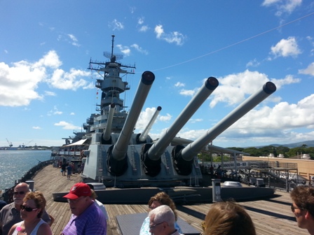 Our next tour was of the WW2 battleship USS Missouri, moored next to the Arizona Memorial, a bus taking us across onto the still active navy base. This battleship is massive, last serving during the Gulf War before being finally decommissioned & displayed at Pearl Harbour. We took an informative guided tour, standing at the spot on the ship where the Japanese Peace Treaty was signed to bring an end to the war against the Japanese whilst the USS Missouri was moored in Tokyo Bay. Then it was a self guided tour through the rest of the ship that we didn’t see on the tour, very interesting & informative. I’m certainly glad it was mapped out as the ship is massive with lots of corridors & rooms. The officers quarters were by far the most spacious & the captain had a massive cabin with lounge, dining room own bath room – the only way to serve on a ship is to be a captain.