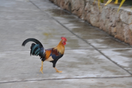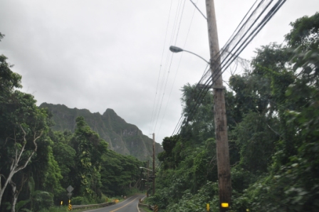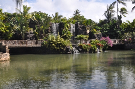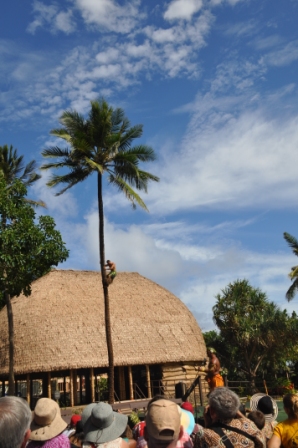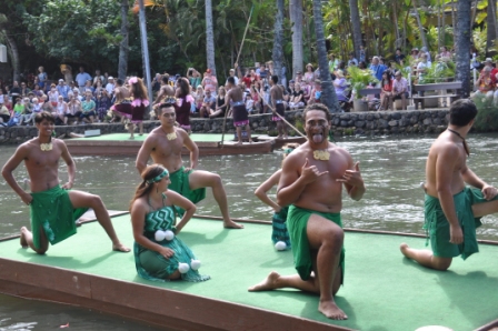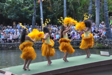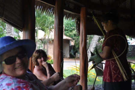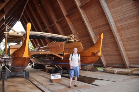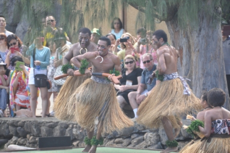 Polynesian Cultural Centre on the north-east corner of Oahu was today’s destination so we took the scenic route along the east Oahu coastline through intermittent showers of rain. We arrived around 12.30 & started to explore the very well set out attraction. It is laid out in a series of different Polynesian villages reflecting the different Polynesian cultures around the Pacific Ocean, Samoa, Tonga, Tahiti, Maori, Hawaii, etc. At set times of the day there are special attractions at each of the villages, our first one was Tonga where there was a demonstration of coconut husking & cracking, then extracting the coconut from the nut. We then learnt how to weave the palm fronds & made a small simple fish each. Next was a dancing exhibition from each of the cultures on double canoes on the waterway, it was very entertaining & the performers all seemed to be enjoying themselves. We looked at a reconstruction of a very large Polynesian ocean travelling canoe then listened to a very informative history on the canoe building, navigation methods & distances travelled. Another item of interest was a talk on the history of the hula dancing & what the different hand & foot movements referred to.