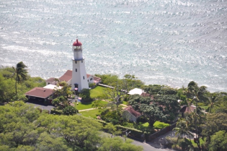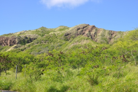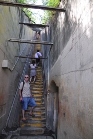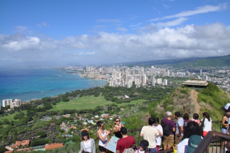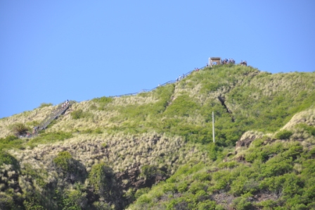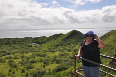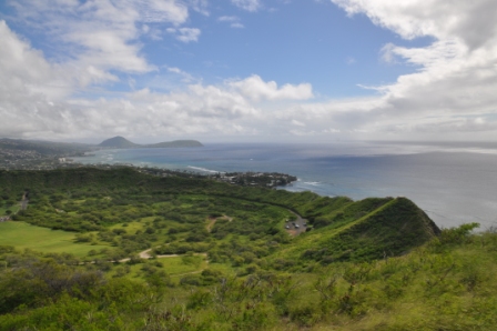 Diamond Head, a volcanic crater dominating the skyline east of Waikiki was this morning’s adventure. The drive was simple & we managed to get one of the last of the available parking spots inside the crater of the volcano, reached by driving through a tunnel through the crater wall. It is very lush & green inside the crater, with lots of acacia trees. The crater used to be a military base with gun emplacements around the crater rim. The walk to the top of the rim started out easy enough with an easy gradient concrete path, however after about 5 minutes walking this turned into an eroded track & got steeper as the many switchbacks up the slope were negotiated. About ¾ the way to the top we climbed up a long steep flight of stairs then entered a long, narrow, uphill tunnel, barely wide enough to pass the people coming the other way. There were lots of tourists walking the track. After exiting the tunnel we were greeted with a choice of an even steeper, longer set of stairs plus another tunnel, then a long spiral staircase or a more relaxed walk with open stairs to the top. Lots of young people chose the hard way. The spiral staircase exited through a concrete gun bunker which had a viewing platform on top at the highest point of the crater.