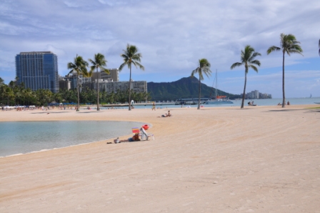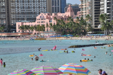 The afternoon we spent walking on the Waikiki beachfront, ate lunch from a “shrimp wagon” on the grass at the Hilton Hotel lagoon. We walked into downtown Waikiki, past lots of very expensive shops, again the Gucci, Fendi, Cartier, Rolex, etc. and some of the old & new elegant hotels. There certainly are a lot of up market shops & high rise hotels & apartment blocks in Waikiki. (so far we haven’t really seen any average peoples shops other than the ABC stores – a mish-mash of groceries & cheap clothing etc.). The beaches at this end of Waikiki were very crowded. After the walk Tereza went for a swim & then back to the apartment where we had a snooze before re-emerging to look at the Friday night fireworks display put on by the Hilton at the lagoon. Both the first fireworks & the last had me jumping as they were so loud, the concussion from the blasts set off a number of car alarms parked in the parking lot behind us. After the fireworks we walked to Ala Moana plaza for dinner. You have all these expensive shops, hotels/apartments & flash boats moored in the bay yet there are many homeless sleeping on the streets. One thing we have found strange is that the price displayed then has tax added when you go to pay & then a tip is expected by the people serving you as their wage rate is very low & they need the additional income from tips to supplement their pay so that they can survive. It feels embarrassing for us to slip money/tip to people, we feel very uncomfortable doing it but understand the need to do so. We are so much more civilised about basic wages etc. in Australia.