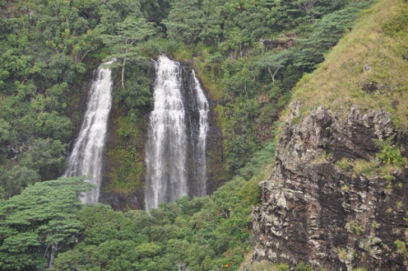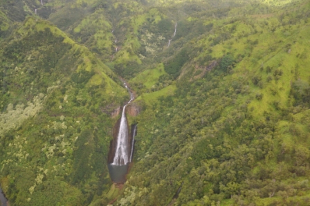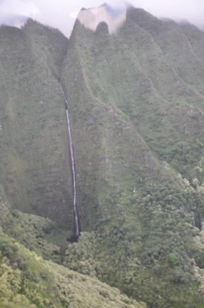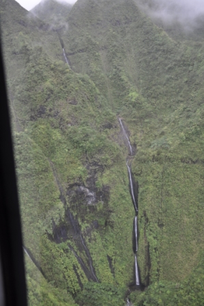 We then flew to the wettest spot on earth & sure enough, it was raining, though not very heavy. This is at the head of a large valley that funnels the moisture laden trade winds up to the base of a large dormant volcano & the clouds have nowhere to go but up, a very long way, cooling & dumping lots of rain as they go. After seeing some very close up views of the continuous over 2,000 foot waterfall we turned back to the airport & left the helicopter with the engine still running for the next group of tourists. We purchased a video taken from our helicopter of our flight.