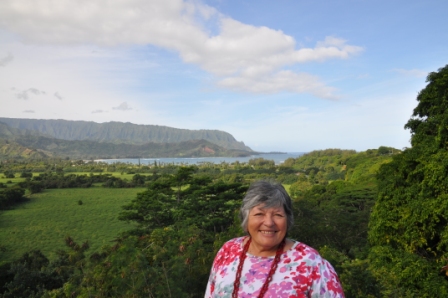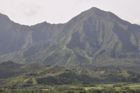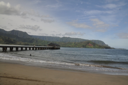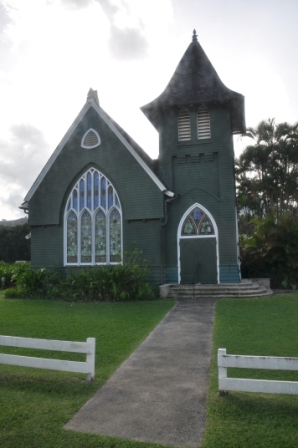 We continued on, looking at different types of trees Kanen pointed out to us, including eucalyptus & macadamia (again), taro being cultivated, before stopping at a scenic lookout over Hanamaulu Bay. We even saw some bison grazing in a paddock in the distance below. Here Kanen pointed out the features of the dragon from the song “Puff, the Magic Dragon”. Apparently the songwriter drew his inspiration from this landform. It is very scenic. We continued on & drove into the township of Hanamaulu Bay, driving on the beach & looking at the houses. Any beachfront house cost $20 million, no matter how daggy it was, with any house across the street costing $10 million, again no matter how daggy. Apparently it is the playground of the rich & famous with movie stars, musicians, film directors, etc having houses there. Kanen did point out a woman he said was famous, she just looked like any other young woman to me. On the way back out Kanen stopped next to an old church that charges $10,000 for any type of reception held there. It did have some nice stained glass windows.