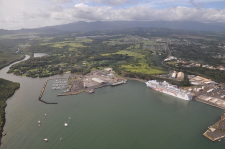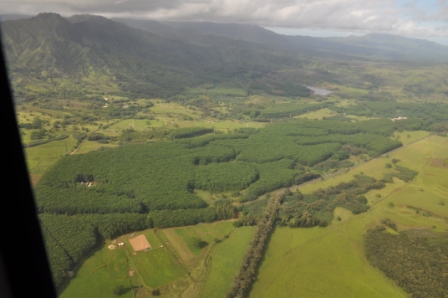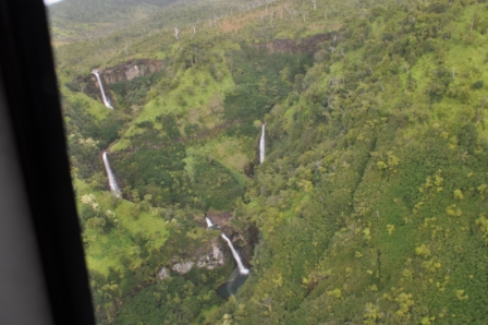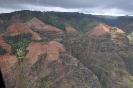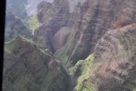 Blue Hawaiian Helicopters at Lihue Airport was next & after the mandatory safety briefing we were allocated our pilots & seating positions. Mark was to be our pilot for our 45 minute flight & he proved to be very competent & informative. There were a lot of other helicopters landing & taking off all the time here & after waiting for a few of them we took off over the south coast, over the harbour & our ship, then following the Kaumualii Highway loosely as we flew. The scenery was amazing, then we reached Waimea Canyon. The canyon was extraordinary, so deep & spectacular. Mark flew us up a lot of the side valleys, then the main Waimea Canyon itself. There is a lot of erosion that Mark explained was caused mainly by the wild goats overgrazing the high ridges & mountain tops. This is truly a rugged & very remote location, accessible only by walking in or by helicopter. Mark showed us the location where a number of different movie scenes were shot.