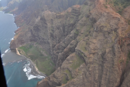 There are not many beaches dotted along the Na Pali Coast, only where a large creek runs into the sea or a large landslip has occurred. Mark told us of a Polynesian tribe that lived only on the Na Pali Coast but disappeared in the 1800s without a trace. Nobody knows what happened to them or where they went. One can only speculate it was either disease or tsunami that took them. The side of the mountains still show some terracing, proof of habitation.