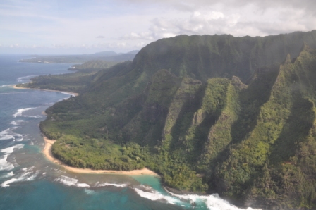 Our next piece of amazement was the Na Pali Coast. This piece of coastline is only able to be viewed either by walking, boat or air, the area is that rugged. There is a walking trail that hugs the cliff sides for around 20 miles, requiring a permit before being allowed to challenge the hike. The hikers must be extremely fit, self contained & not be afraid of heights, the trail is amazingly rugged. The Na Pali Coast is even more spectacularly beautiful than Waimea Canyon. This piece of coastline is normally very wet & cloudy, however, lucky for us, today it is dry & we are rewarded with some amazing sights. The Na Pali Coast is covered with waterfalls & small green ferns, it is too steep for trees in most locations. Mark shows us a small islet just off the coast, it is covered in a species of palm trees that are unique to the islet, found nowhere else in the world, we were looking at the entire population of these types of palms, maybe 100 in total.