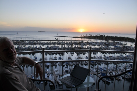 We got up at 6.30 pm & watched our arrival at Honolulu & marvelled how expertly the Captain moored the ship (he has been doing it for about 9 years so he should be good). We went for breakfast & said our goodbyes to Francisco, our favourite waiter & Thomas. Back at the cabin we collected our luggage, found Ramasom (who has an enormously busy day to get the cabins ready for the next onslaught of cruisers) & Jose. The debarkation was just a walk off & since we carried off our luggage no delay at all. We waited for while for a shuttle bus to take us into Waikiki to the car rental place. They didn’t have many cars so we ended up with a Mustang, now we really feel like “the Aussie tourists” in America. We drove around the north coast, even going off on some beaten tracks, stopping at some beaches & admiring the scenery. We stopped at a shrimp shack for lunch, we were disappointed this time (may be our taste has changed). Back in Waikiki we found our new apartment – it is an older place but clean, well appointed with king size bed (may be that is the norm because there are so many big Americans) dining area, lounge (huge T.V.) lovely kitchen, bath room & washing machine & dryer. We are on the 13th floor, the building is right across from the marina so we have a million dollar view. We watched the Pride of America sail out. We phoned James, Monica & Ron’s sister Vicki. We went out for an adventure to find a place to eat. Everywhere it was so busy – we ended up in the Ala Moana shopping plaza where it was so busy too. After some wait, Ron had some seared Ahi fish & I got fruit salad from the food court (not cruise standard but not bad at all). Back at the apartment Ron crashed, he was so tired from all the driving, concentrating as it was a week-end with all the locals out, busy traffic & not to mention driving on the right hand side of the road.