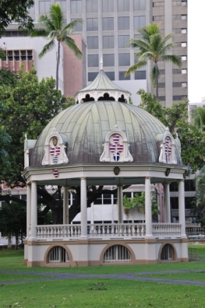 The grounds outside also have the original pavilion constructed for the coronation of King Kalakaua plus a gated garden containing his crypt holding the remains of a number of members of the royal family. While we were inside the palace a collection of fire trucks & fire ladder trucks arrived with a host of firemen. Once outside we found they were in the middle of a photo shoot, they all had on their dress uniforms. It may have had something to do with the day being Veteran’s Day in the USA, it was a public holiday.
