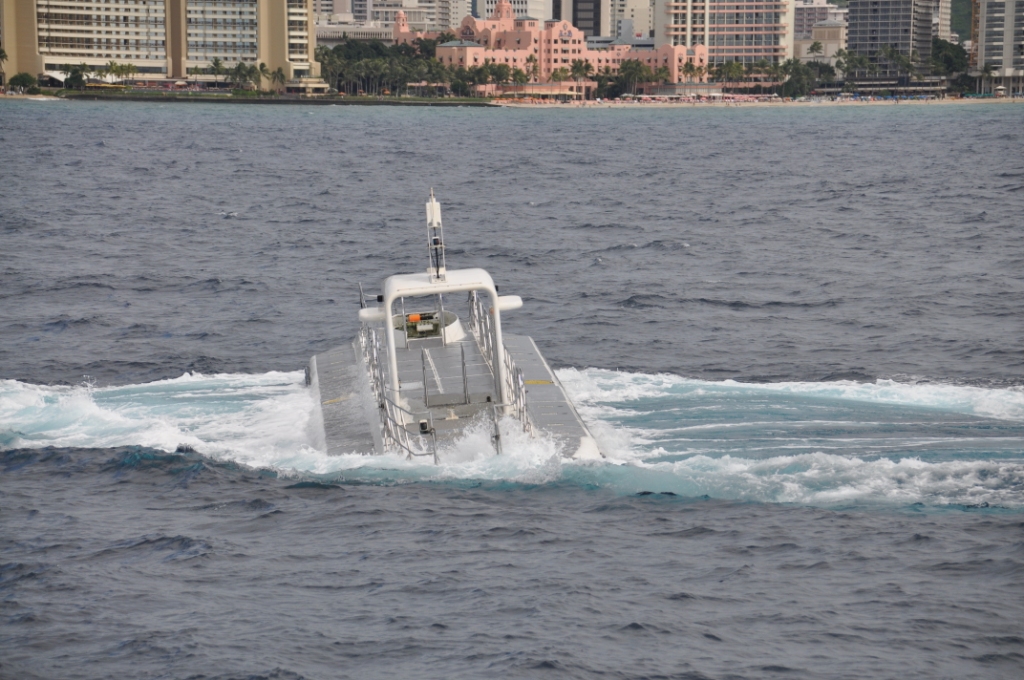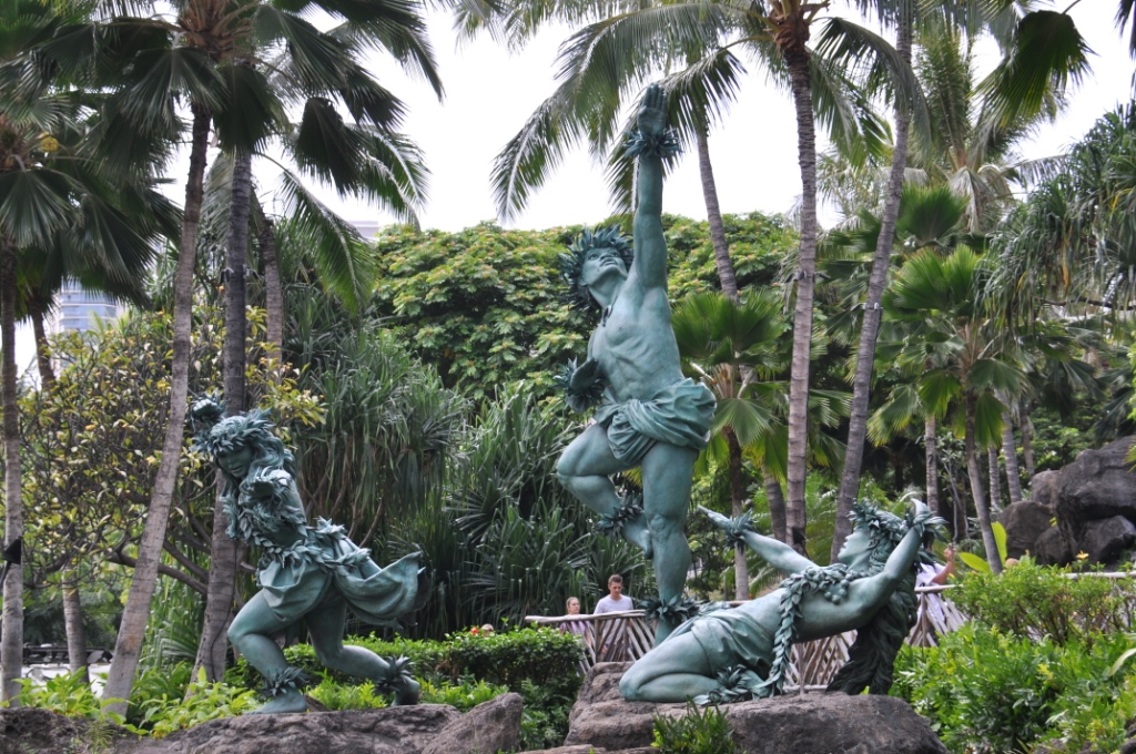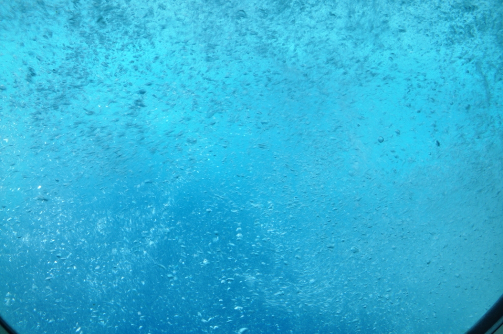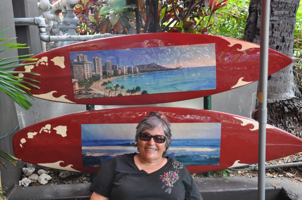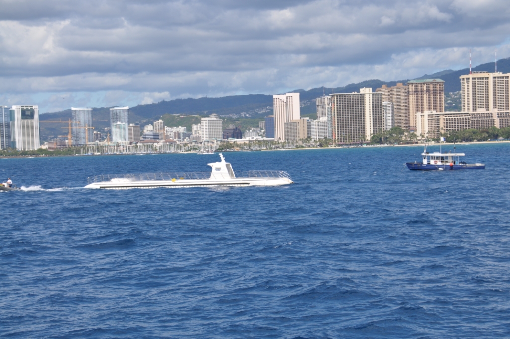 Submarine day. An 8am start with a walk down to the Hilton Hotel beachside to book our tickets for the 11am adventure underwater on the Atlantis submarine. Atlantis operates two submarines out of Waikiki, an older 65 feet 48 passenger & a newer 100 feet 64 passenger submarine. We chose the newer larger submarine as it had larger viewing ports. After we booked we wandered back through the grounds & shops of the Hilton Beachside complex, they have done a great job with the landscaping, with ponds & waterfalls & tropical plants with pathways meandering amongst them all. After breakfast at Snapper’s again, it was another leisurely stroll through the Hilton gardens, out onto the Hilton wharf & await the transport boat out to the submarine, a vessel called, naturally enough “Atlantis”. Mostly Japanese passengers disembarked from the ferry boat Atlantis & most of them looked decidedly seedy, as though they had a touch of seasickness, there was hardly a smiling face amongst them. When it was our turn to board the crew told all on the speaker system that the water was a bit rough & they recommended people come onboard & buy some Dramamine, a motion sickness tablet. We were the first two on board as I thought it better to buy insurance than suffer.