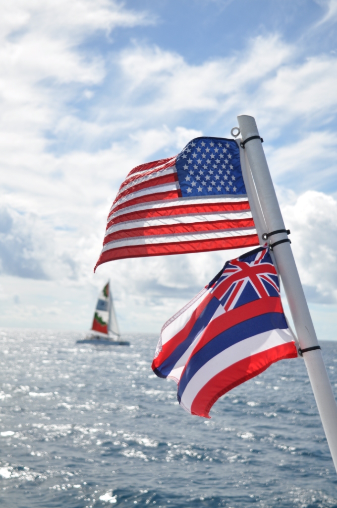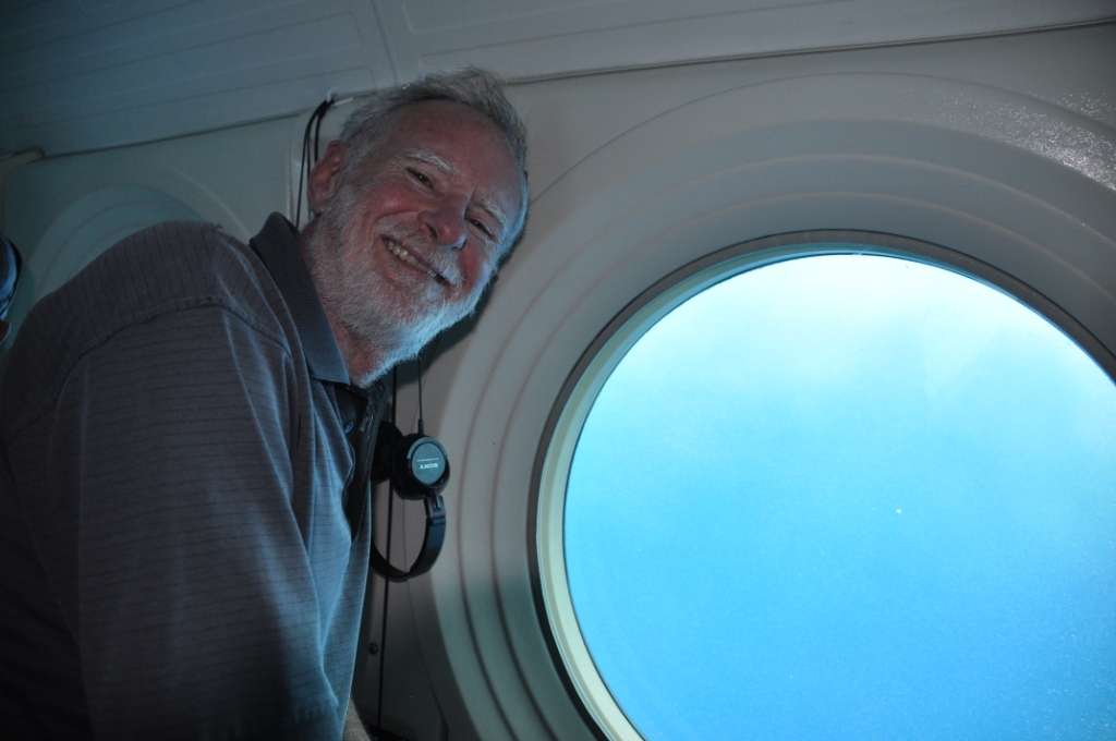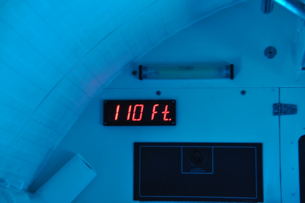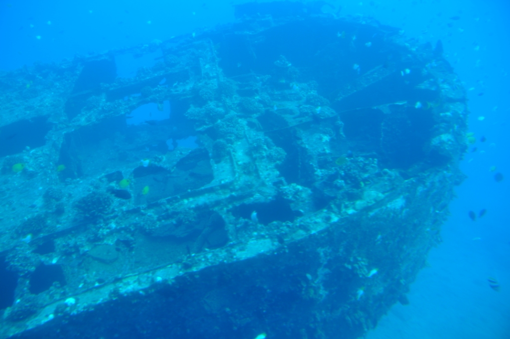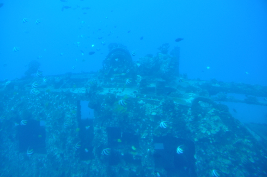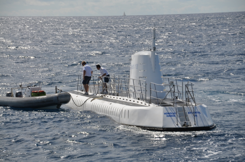The ocean was a bit choppy & once the boat stopped & waited for the submarine to surface it got decidedly rocky. The submarine looked spectacular as it surfaced, seeming to leap out of the water. Boarding was a straightforward matter, a near vertical ladder fore & aft & seating inside looking out either side through large portholes. The submarine was a lot more stable than the ferry boat on the surface & once we submerged all sense of motion disappeared, apart from the tilting down as the submarine dived to the ocean floor. As we descended a few large trevally (fish) came into view, investigating us. We followed a path on the ocean floor at about 80 feet past a collection of artificial reefs that had been built & deployed by the University of Hawaii as fish holding structure. They certainly had a collection of fish around each of them, with some large moray eels poking out of holes around the base of the structures. Next we passed the ends of some old lava flows that had some coral growth on the upper parts, with subsequent fish holding around the coral. We then passed the wreckage of an old aeroplane, then the wreckage of two ships that the Atlantis company had purchased & sunk on location to provide some interest & structure for fish to hold to. The aeroplane had some very large trevally holding under both the wings & both the ships had masses of a huge variety of fish all throughout the structures, there were some really big moray eels visible. A special treat was seeing two huge green sea turtles on the rear deck of the large sunken fishing boat. We touched the bottom a couple of times at 110 feet underwater. Amazing to see so clearly that far down, however, some of the colours were washed out because of the depth & the filtration of the different wavelengths of light. All too soon (aprox. 45 minutes) it was back to the surface with a rush of bubbles & back onto the ferry boat. We stopped & watched the smaller submarine surface & did the passenger swap over before heading back to shore, accompanied by the big Hilton sailing catamaran. It was still fairly choppy & a lot of people were violently seasick, I am glad we took the Dramamine.