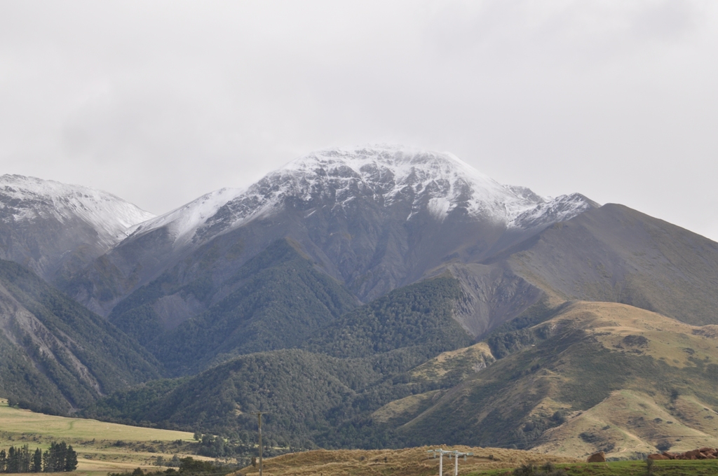 the walk last night back from the crayfish restaurant to the motel became clear as we drove out of the motel driveway, the mountains just behind Kaikoura were covered in a fresh coating of snow. The temperature was brisk as we drove off towards Hanmer Springs along the “scenic” route through the mountains, rather than along the coast. Well, the scenic route was definitely scenic with all of the snow looking spectacular as we drove higher up into the mountains. The road was winding & twisting up & down through all of the creeks & rivers with the mandatory single lane bridges. I am so glad that Ron is driving & Ron is so glad that Ron is driving too. Some of the countryside is very similar to areas in the New England region of NSW. Some of the creeks & rivers had a reasonable flow due to the overnight rain. There were not very many cars travelling this road, we didn’t catch up or get passed by any & only met about 4 or 5 coming the other way. There are also not many people living in these mountains, it’s fairly isolated. Very pretty with all the snow.