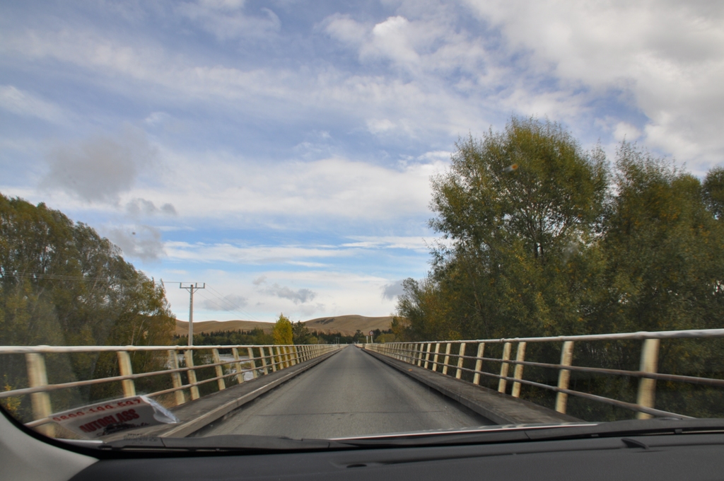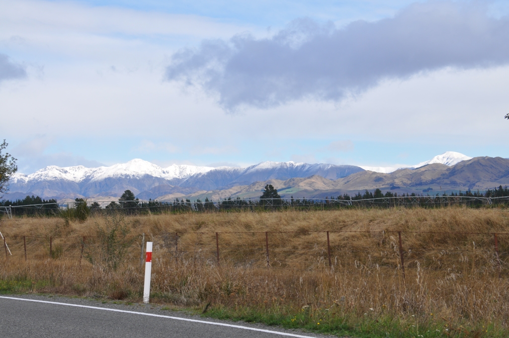 Next it was on the road again south & just outside of Hanmer Springs we stopped at the single lane bridge crossing the Hanmer River where there are people bungy jumping off the bridge above the river & being picked up by a jet boat in the rushing river below. Not on our bucket list. The rain & snow overnight was flooding the river & it was really rushing through the gorge below the bridge. The drive down towards Christchurch was uneventful, the southern alps to the west were covered in snow & bathed in sunlight, stunning scenery.