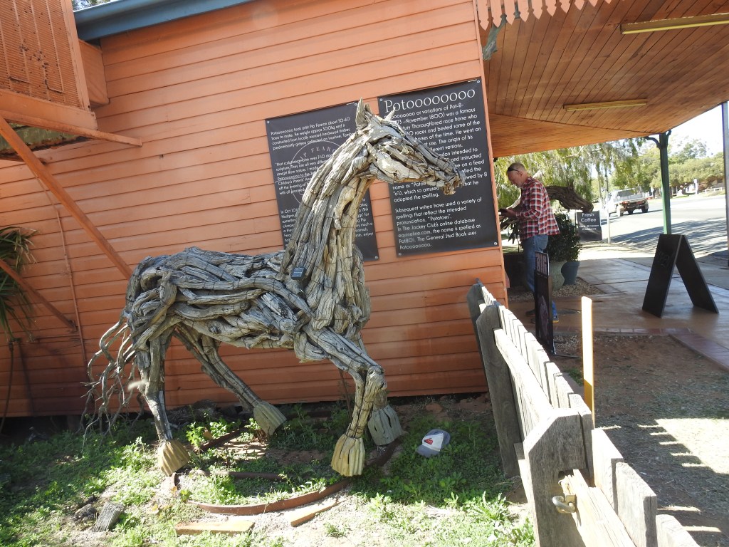 Our drive through to Tambo for lunch was uneventful, more long straight flat roads and lots of caravans coming from the other direction. The scenery was more of the same, horizon as far as the eye can see, grasses, short trees & scrub. The Fanny Mae’s Café in Tambo served great food and coffee, it was a popular stop for the locals and tourists alike. Outside were some amazing horse sculptures from dried tree branches.