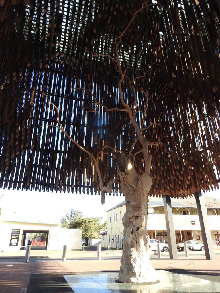 Barcaldine was our next stop and at the railway station is the Tree of Knowledge monument, the place where the Australian Labour Party was formed and the union movement was started in Australia by the shearers. A fairly impressive and very large monument with long timber chimes making music in the wind. We refuelled again and headed towards Muttaburra, stopping just south of Aramac to set up our bush camp for the night in off the road a bit. The caravan park in Barcaldine was packed full like sardines. It is so pleasant out here by the river with only a few other caravans’.