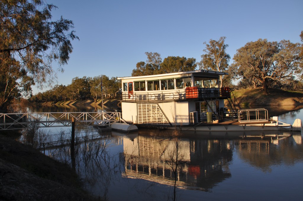 The trip was uneventful, a few road trains coming the other way and some roadworks. Tereza had a few small naps & I reassured her that she didn’t miss much, the scenery is fairly unchanging, trees, bushes, grasses and shrubs with some bright red dirt now and then. We made good time & arrived in Bourke a bit after 3pm and refuelled before heading a few kilometres north of Bourke to the Kidman’s Way caravan park. This park is very nice indeed, after setting up Tereza & I went for a walk to the banks of the Darling River. This river is also flowing deep and fast, with lots of dried mud on the bank from recent flooding events. There is a paddle wheel river boat tied up to the bank, PV Jandra, built in 2000 and modelled on an old original paddle wheel steamer. The Jandra is used for pleasure cruises along the Darling River.