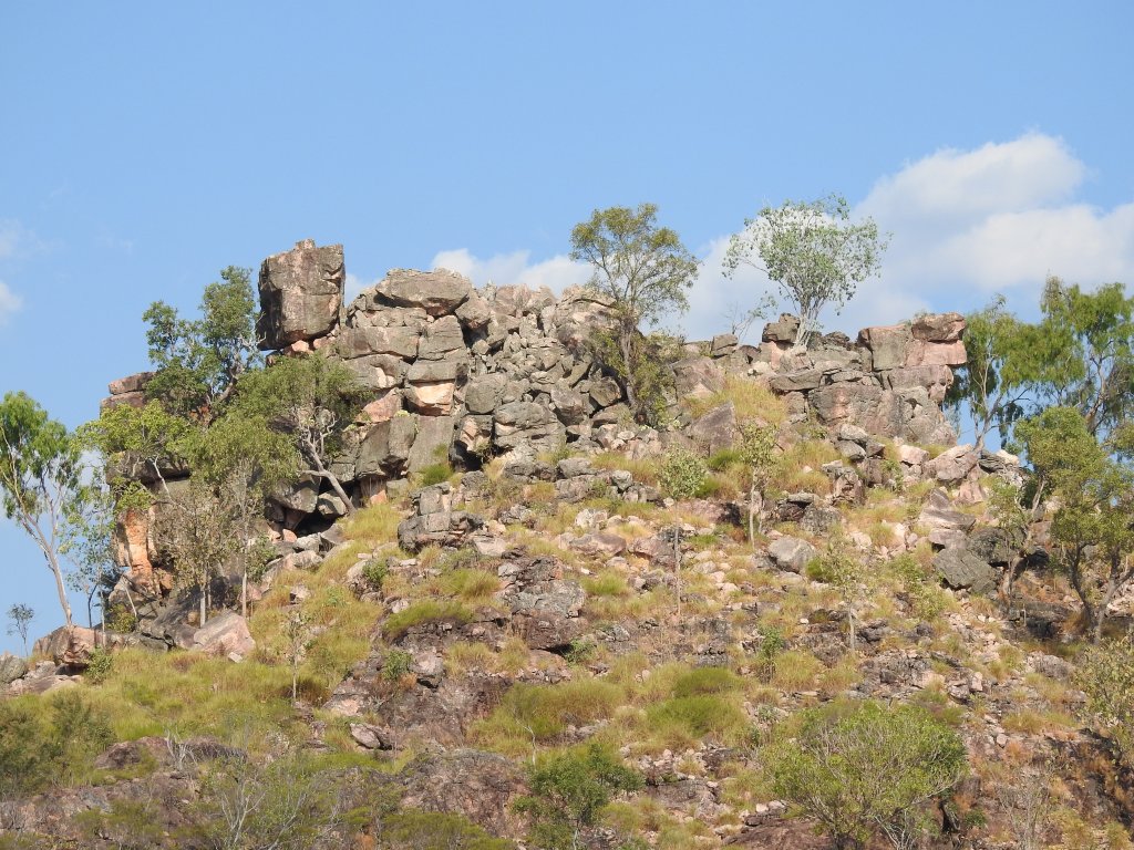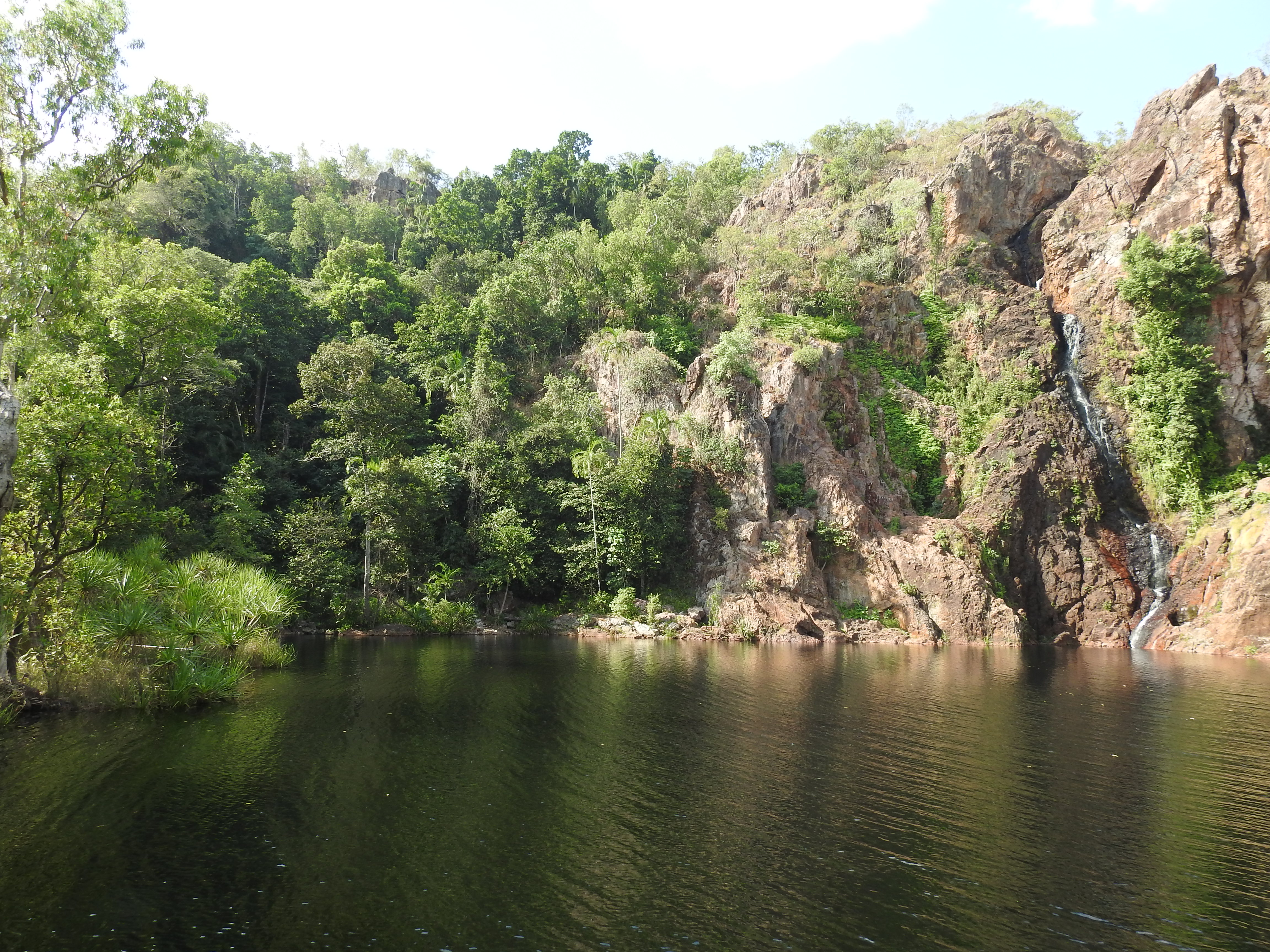 We drove out of our Nitmilik camping spot at around 8.30am and hardly saw another vehicle during the 29km trip into Katherine. There is a bit of nice street art in Katherine on the sides of buildings. We refuelled, picked up a loaf of bread & headed north again. The river as we crossed the bridge out of town was full of water. The traffic gradually built and there is lots of oncoming traffic. It is Saturday, & we lucked it in a public holiday long weekend in Darwin. The termite mounds start to get taller and there is lots of pandanus trees around. The trees are all growing taller here and the bush has been burnt a lot. We reach Pine Creek and pass the road into the bottom part of Kakadu. The road is now climbing and twisting and turning as we travel through some escarpment country, this is a lot more interesting to see. We reach the town of Adelaide River and the oncoming traffic builds more. Before long we reach the turn-off to Litchfield National Park, our destination today.