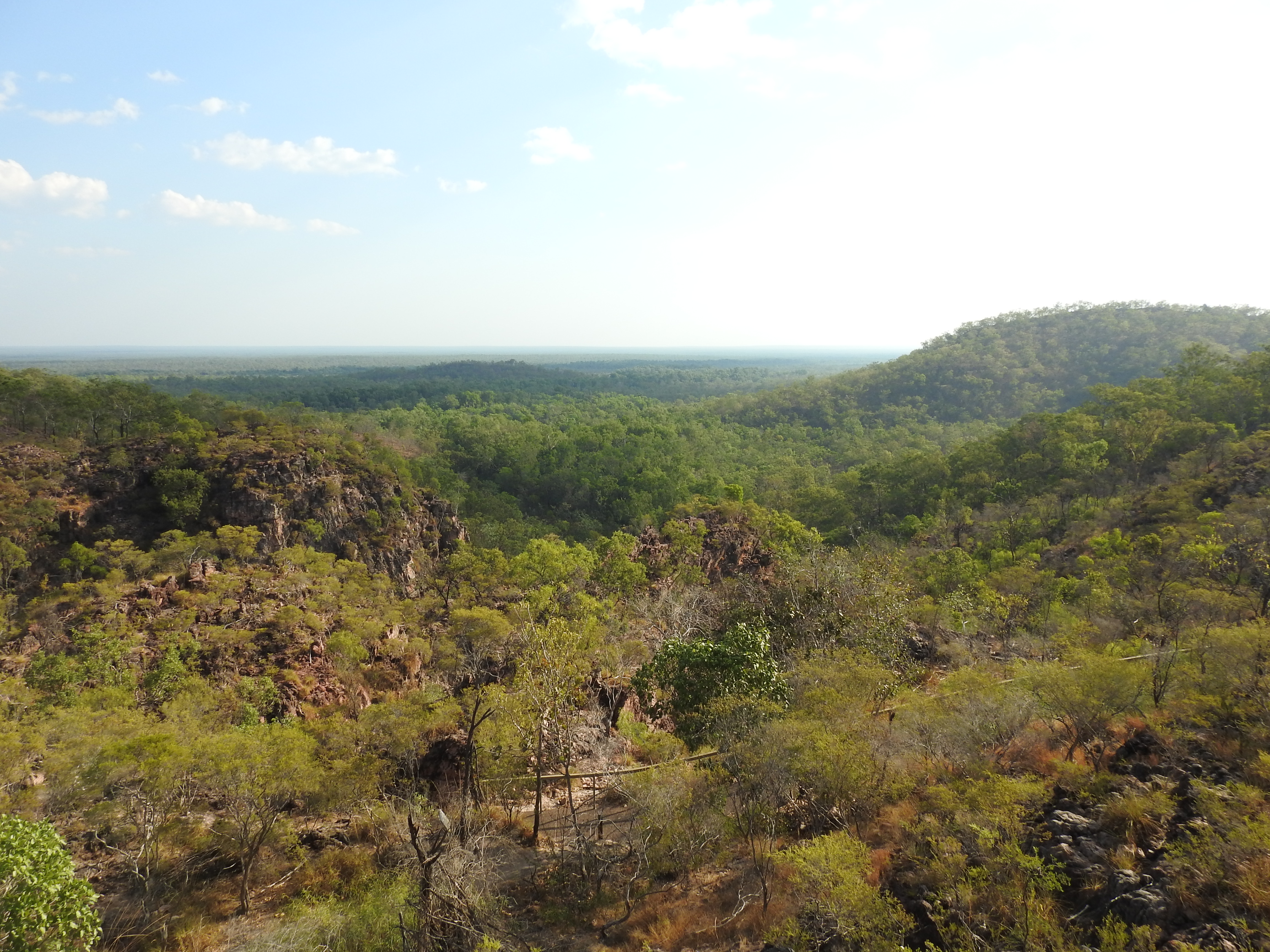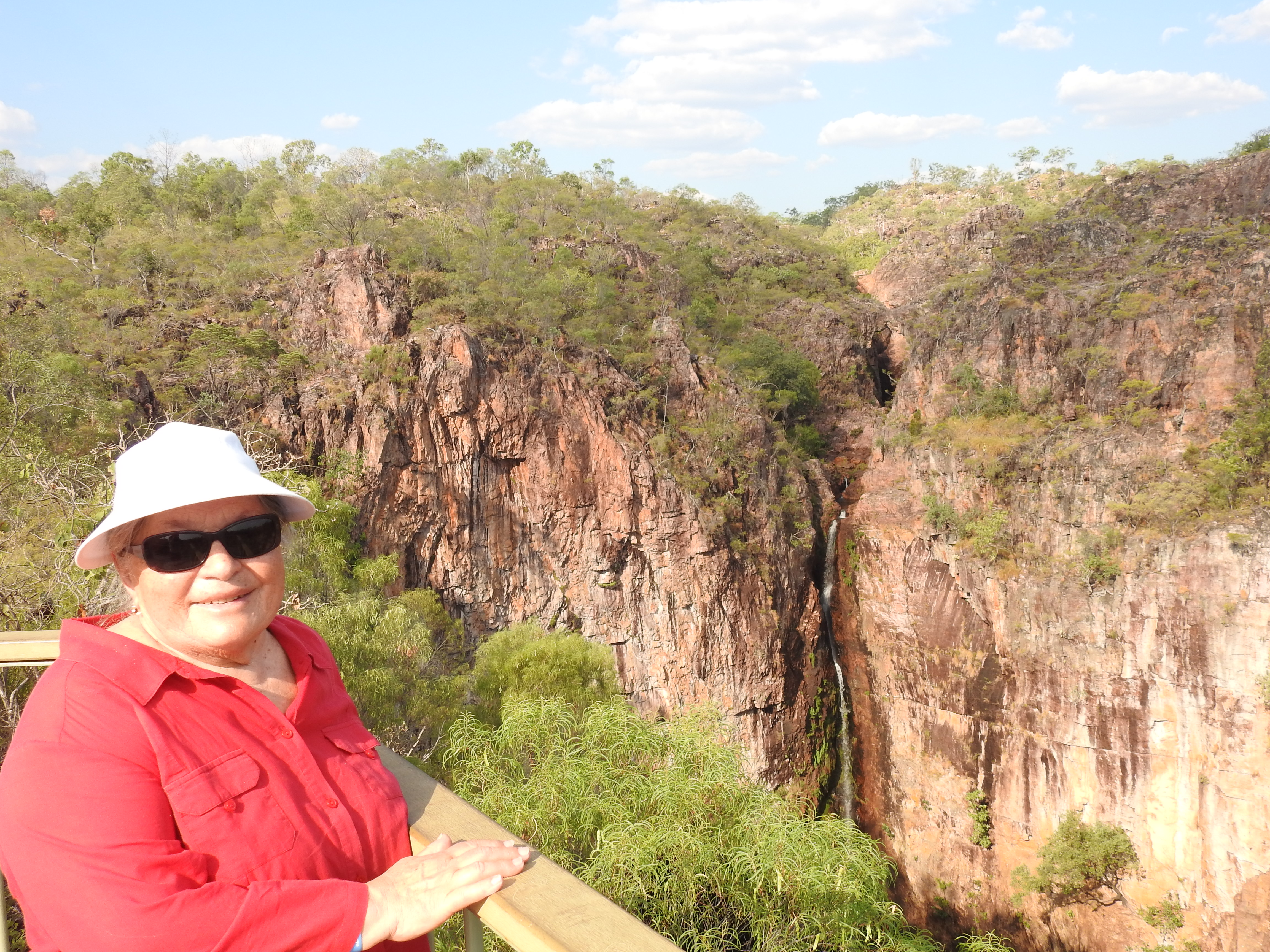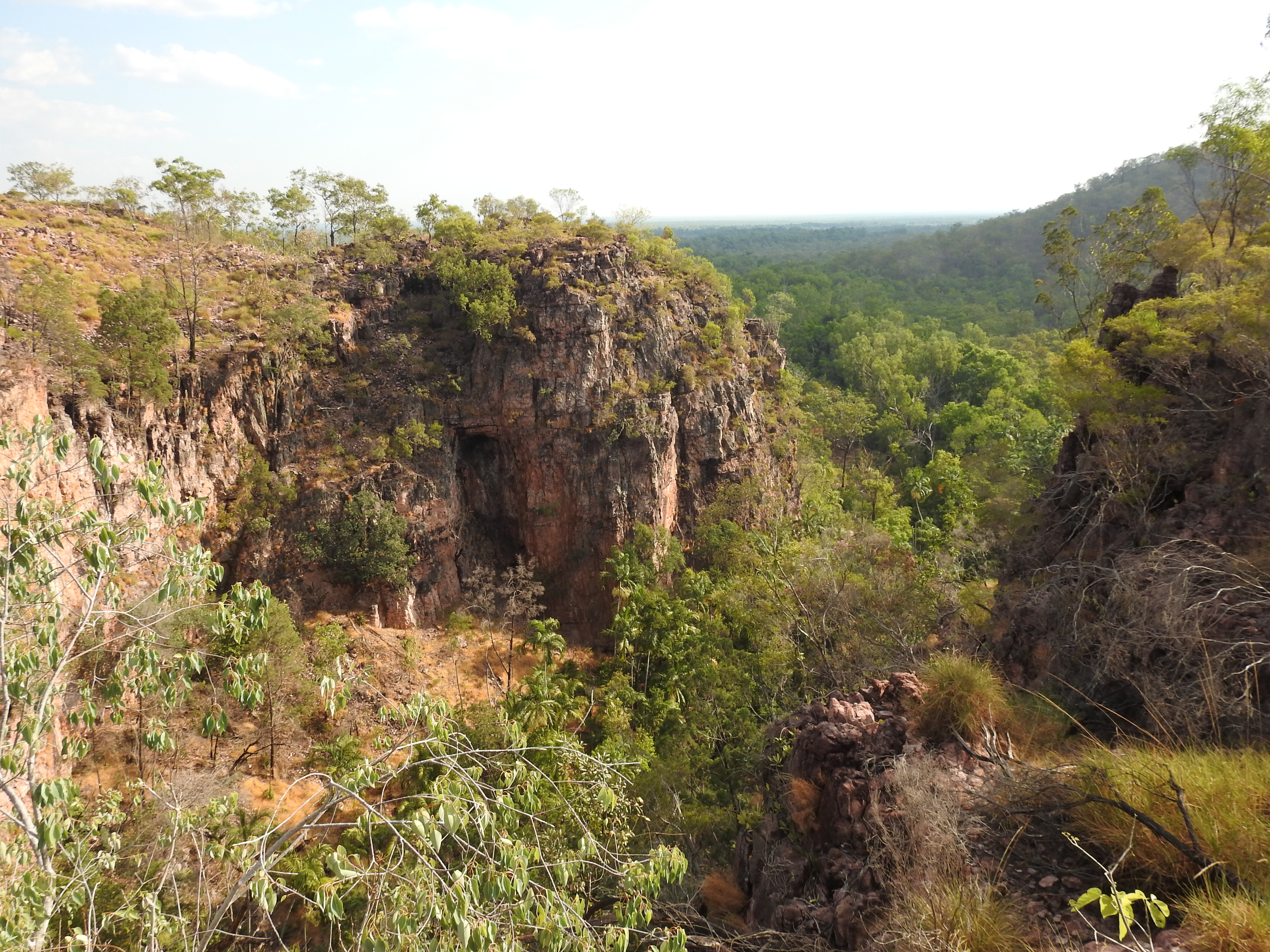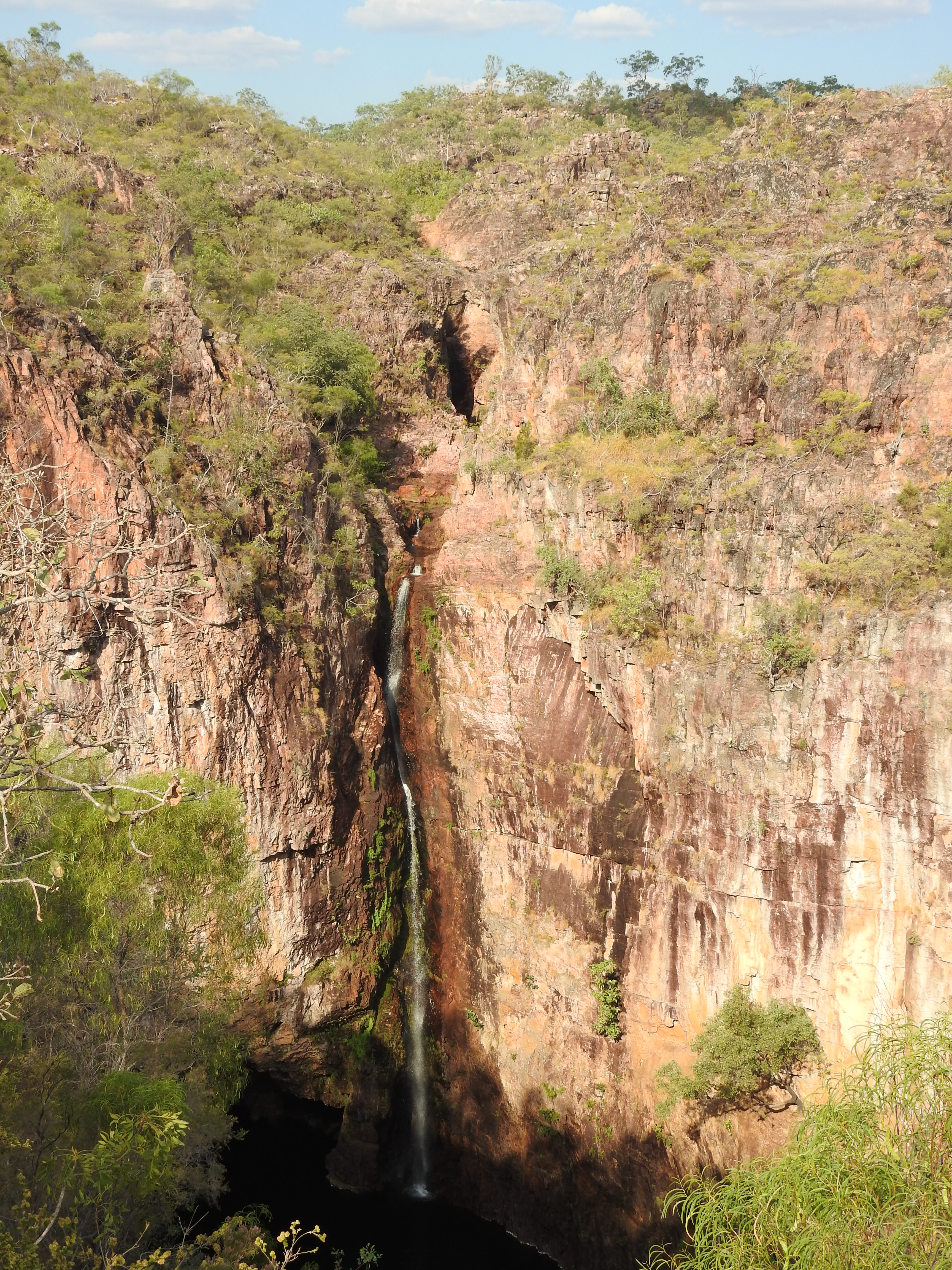 Our next stop is Tolmer Falls, a few kilometres further on and a short distance off the main road. The walk from the carpark is great, a nice wide concreted pathway with a gentle gradient to the falls lookout. The lookout is over the gorge and is a sheer drop hundreds of feet below. The fall does not have a lot of water but it is very long and drops into a deep pool below. Access to the pool is prohibited due to the risk of disturbance to the resident bat populations that reside in the caves at the falls. It is very stunning landscape looking out over the floodplains and into the gorge that has been cut so deeply into the sandstone.
