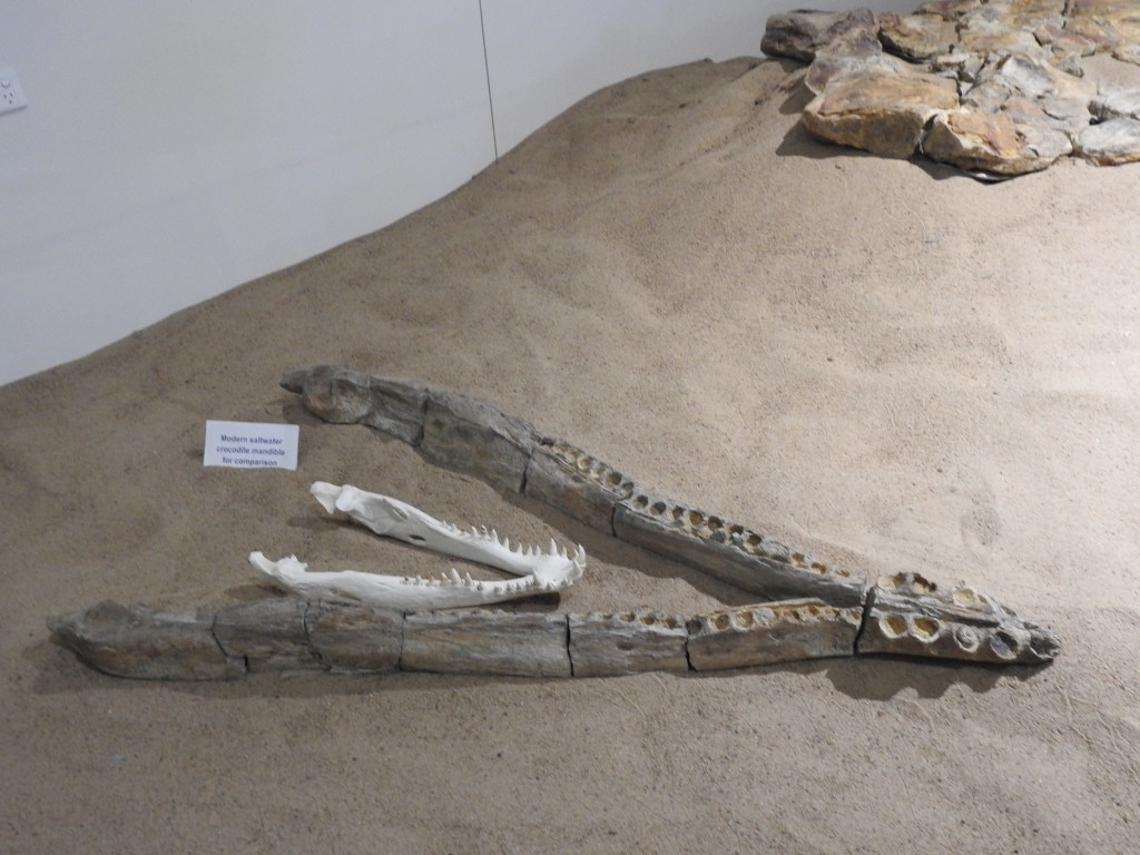 The drive to Richmond is around 100km and more of the same flat endless plains. At least now we know why, the plains were formally the seabed of the very large Eromanga Sea. The road is mostly good & we reach Richmond around 11.30am and stop outside Kronosaurus corner, another dinosaur museum. The Richmond area has produced some world firsts in dinosaurs with the most notable being the very large Kronosaurus, a sea creature with a formidable toothy mouth. They have a nearly complete skeleton of a dinosaur which has not been named yet. This museum is large and well laid out with lots of real dinosaur specimens on display, all from the Richmond area. We enjoyed lunch at the museum café. We drove over the bridge of the mighty Flinders River, all sand, no water.
