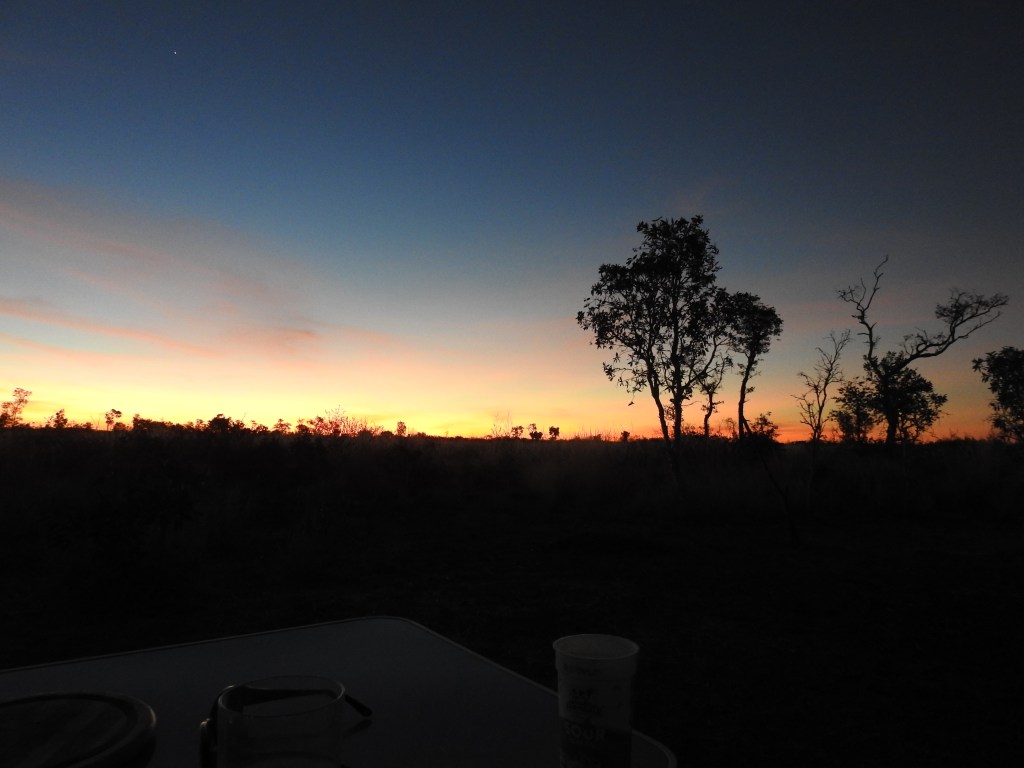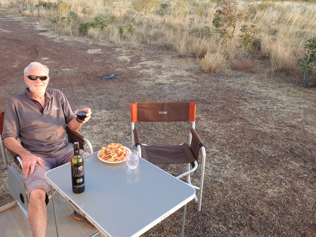 At the Northern Territory border we were stopped at a police checkpoint to examine our Covid documentation and after checking it all, the nice policewoman allowed us through. We changed to Northern Territory time we are half an hour behind our normal time. We stopped at the next rest stop for lunch under the shade of a picnic shelter before continuing our journey. We refuelled at Barkly Homestead and kept going before stopping at Bore 41 rest area about an hour before sunset. Lots of caravans in here as well. We drove further into the bush before finding a nice spot & setting up camp for the night. We had dinner sitting outside. It was a beautiful balmy evening just sitting & watching a gorgeous sunset & sipping on a nice red. We sat for a while & enjoyed the huge sky full of stars, but after Ron driving 650 or so kilometres today tiredness overcame him. One realizes how big this country is & how harsh an existence is for anyone or anything to survive out here. Another great day.