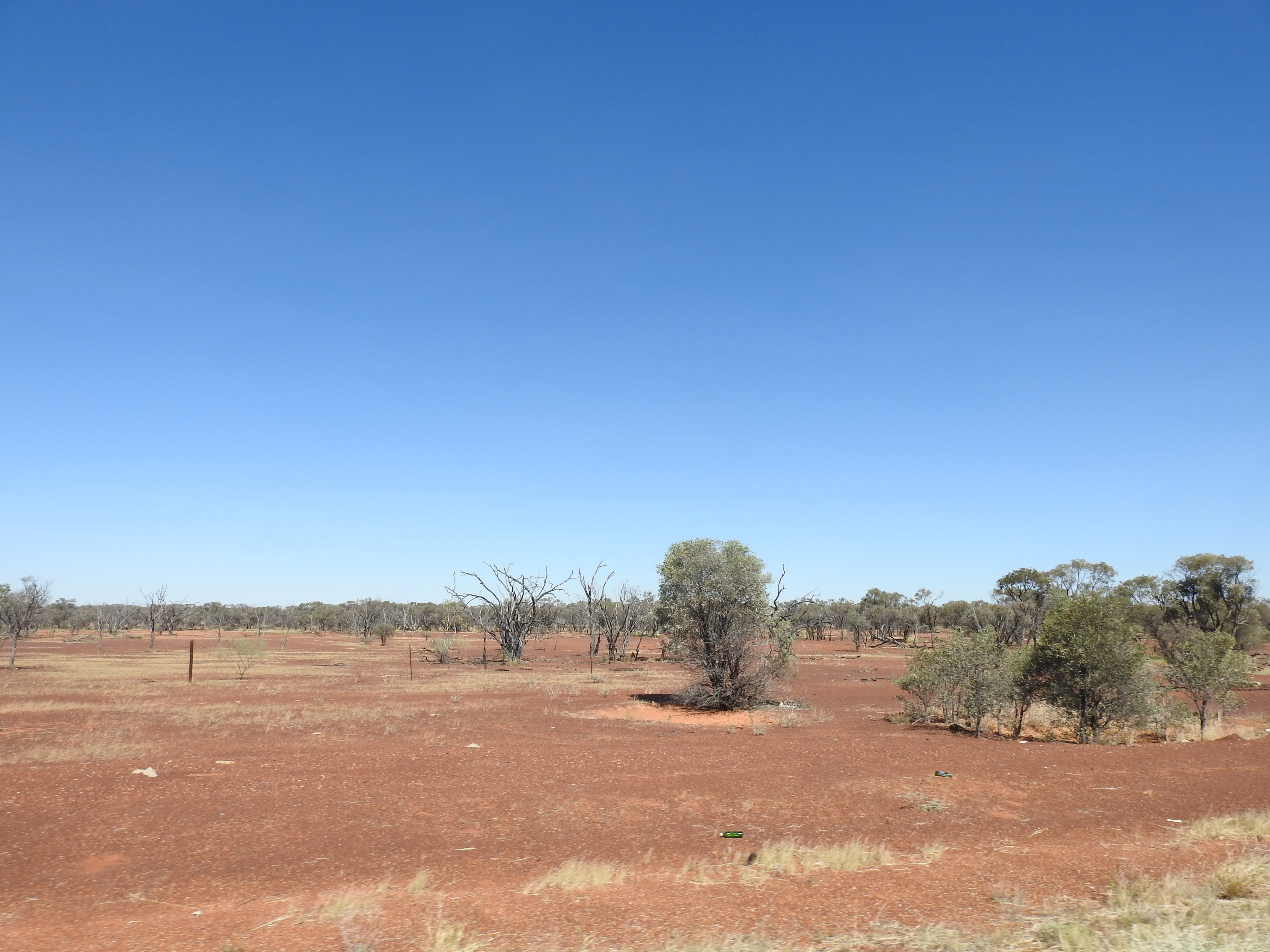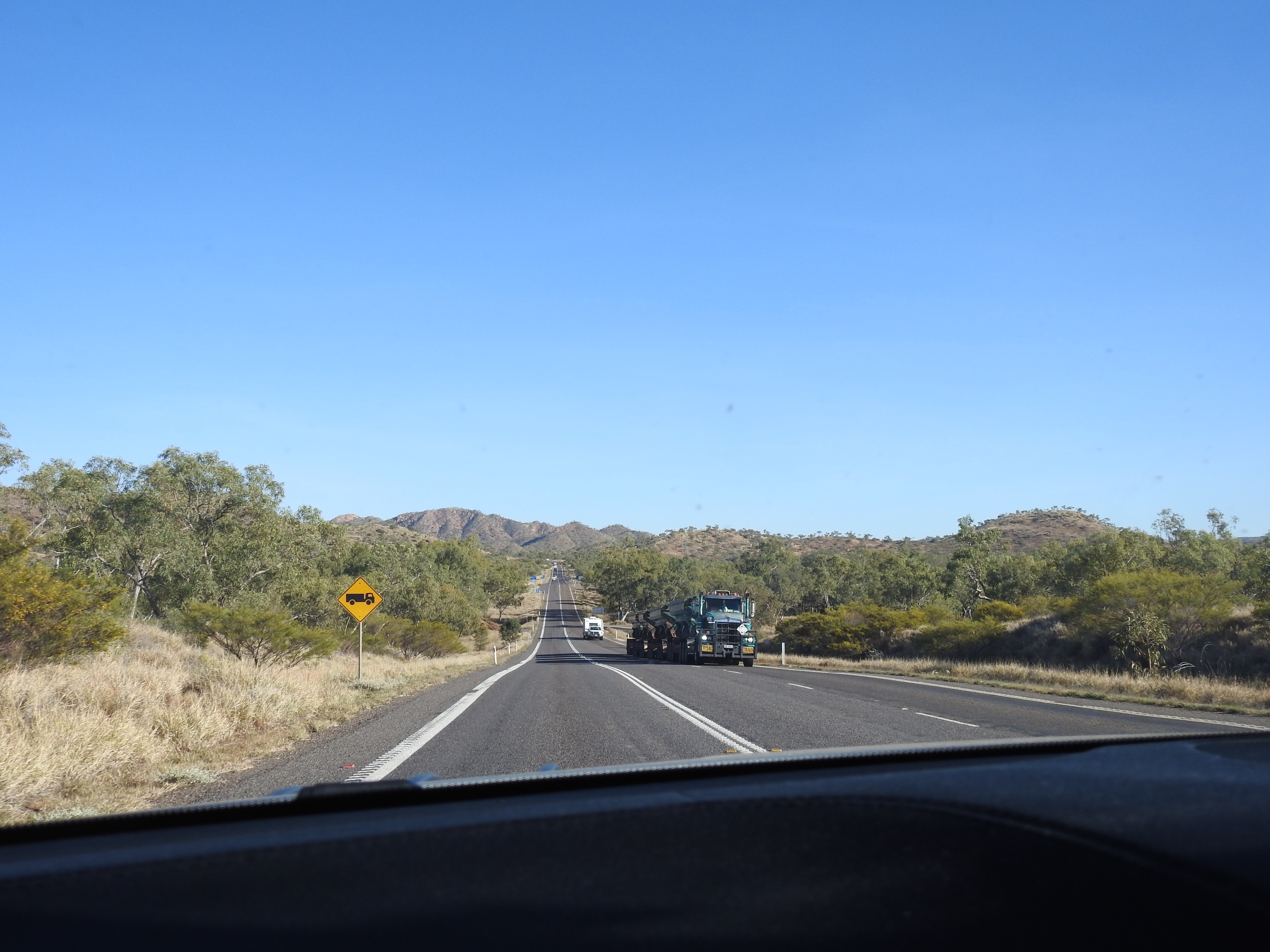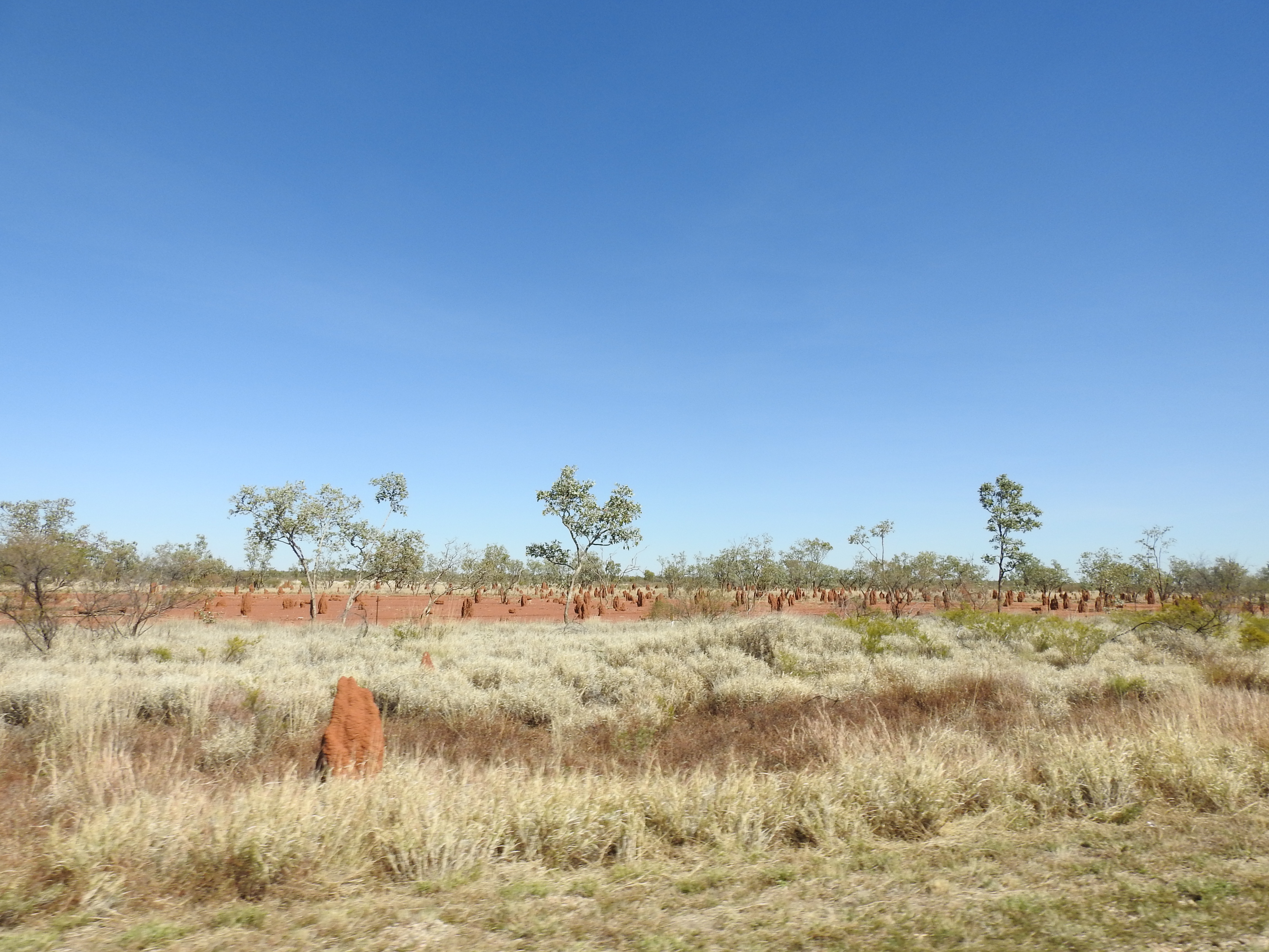 The road out of Mount Isa is more mountains & rocky outcrops (so exciting after the days of flat grass land but this excitement was short lived) before eventually becoming long endless plains with sparse vegetation but different in some areas with larger trees & denser bush something we haven’t seen for days. There are lots of termite mounds on the red soils, looking like tombstones in a cemetery at times, there are that many of them. The road becomes endless straights disappearing into the heat haze in the distance. Outside temperature is 33 degrees. We eventually arrive at Camooweal & decide to stop for fuel & lunch, however the queue at the only fuel station is long and we decide to keep going.