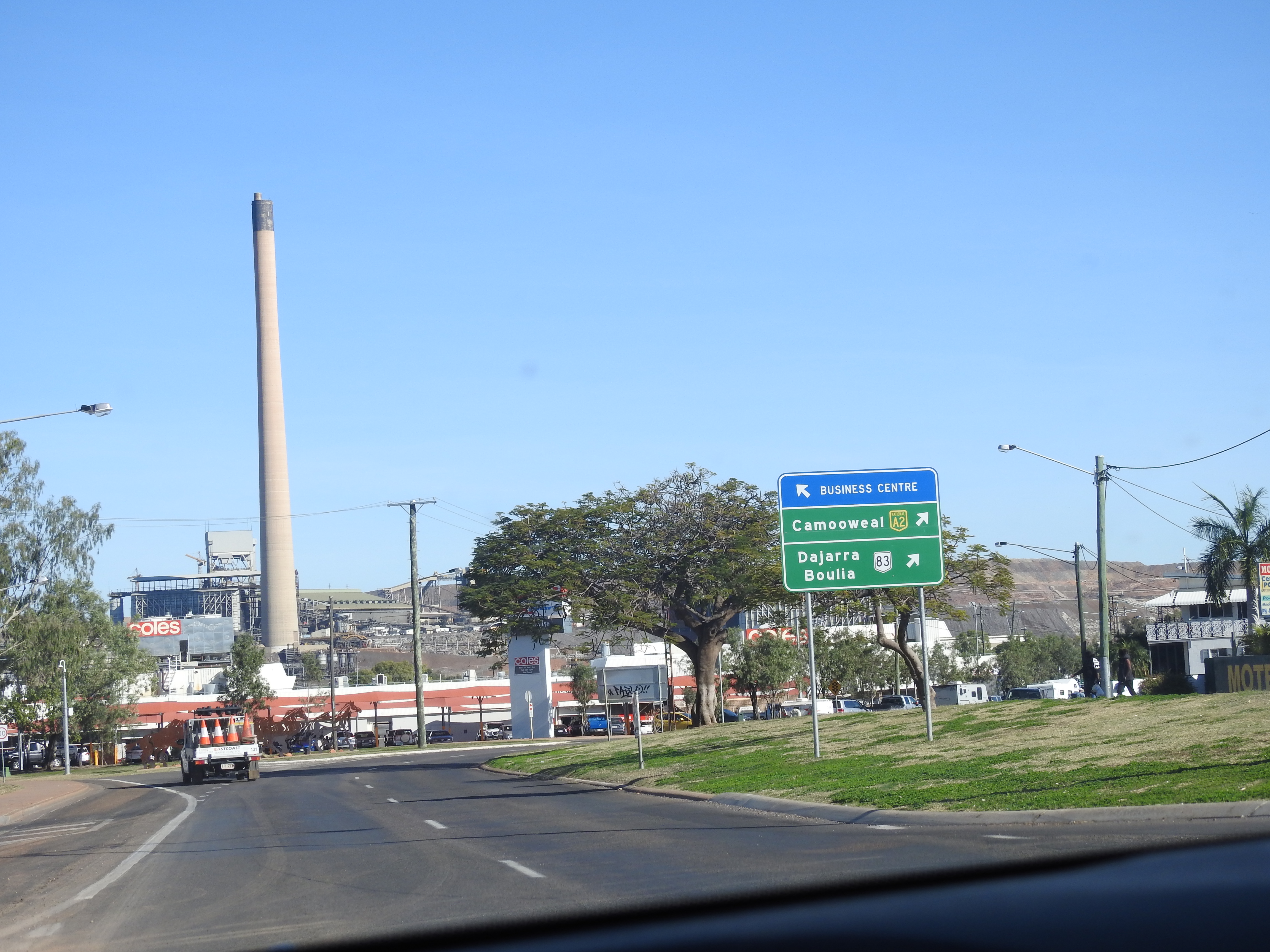 We were away from Corella Dam before 9am and on the road again through more mountains and rocky outcrops. As we came over the rise into Mount Isa the two really tall smoke stacks from the mines are very prominent, one belching a large amount of smoke. The mine workings are prominent above the cityscape. The town is big with lots of similar shops like in any other big cities. We stopped at a shopping mall and bought a few food items from Coles. Lots of schoolkids walked past, probably off on an excursion. We gave Sue & John a call to see how Sue is going. They are nearly in Dubbo on the way home, so disappointing they are not with us.