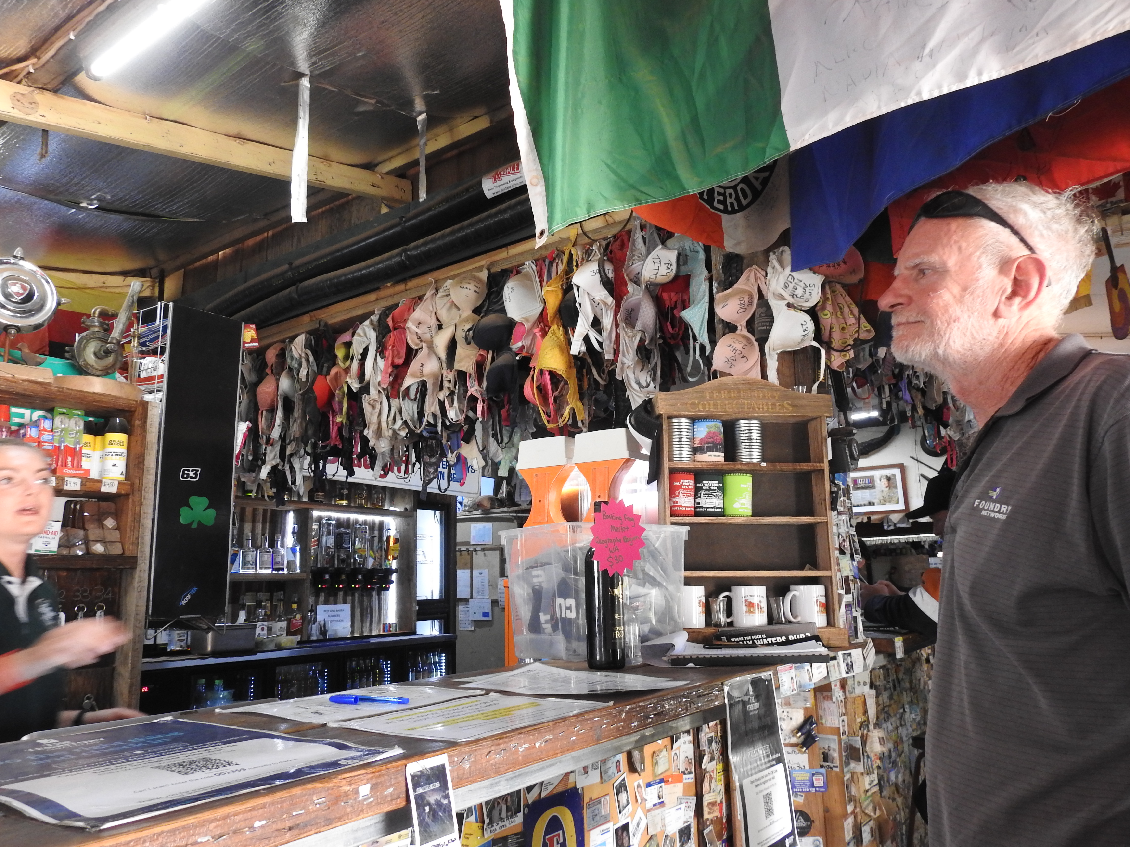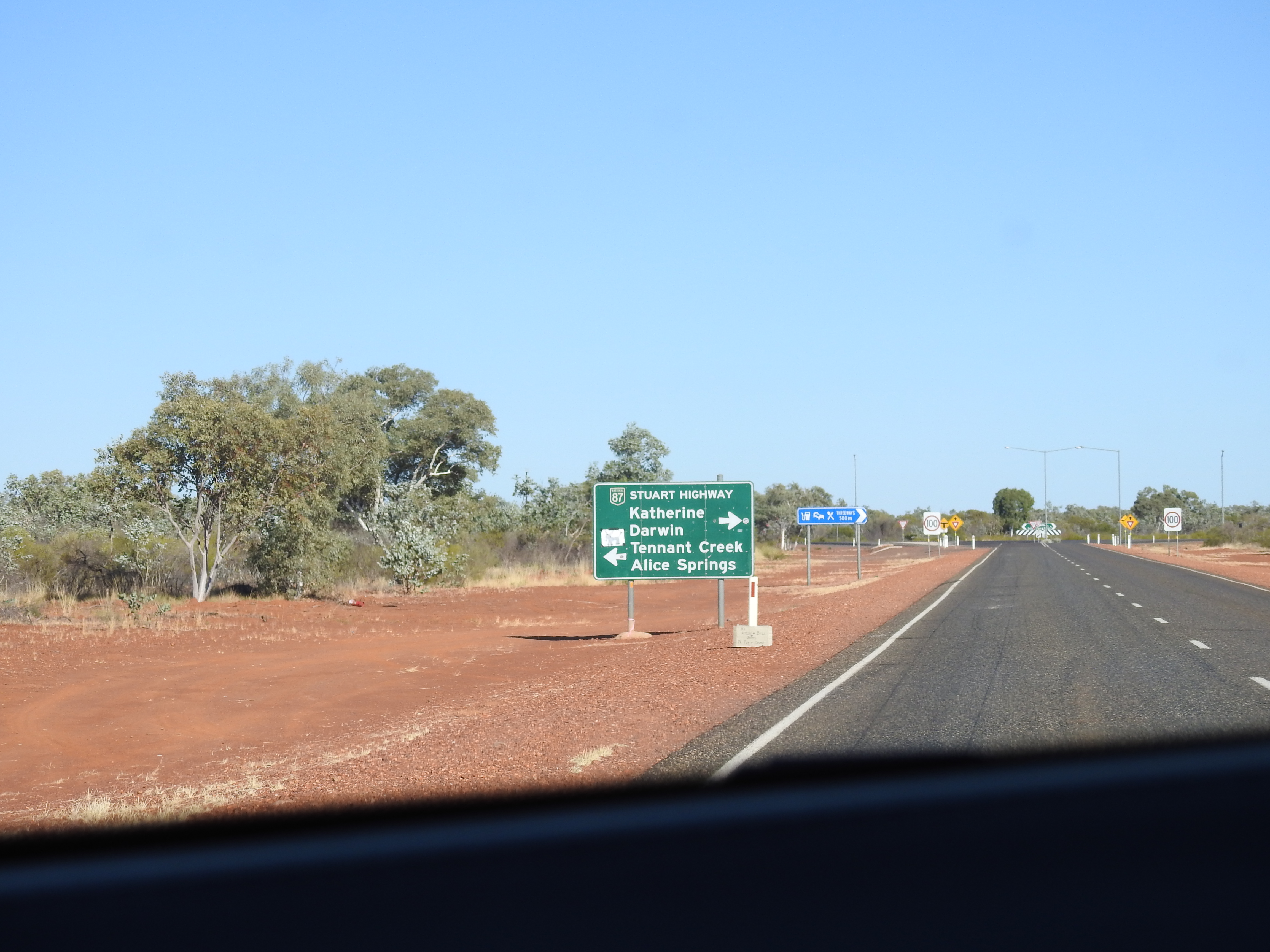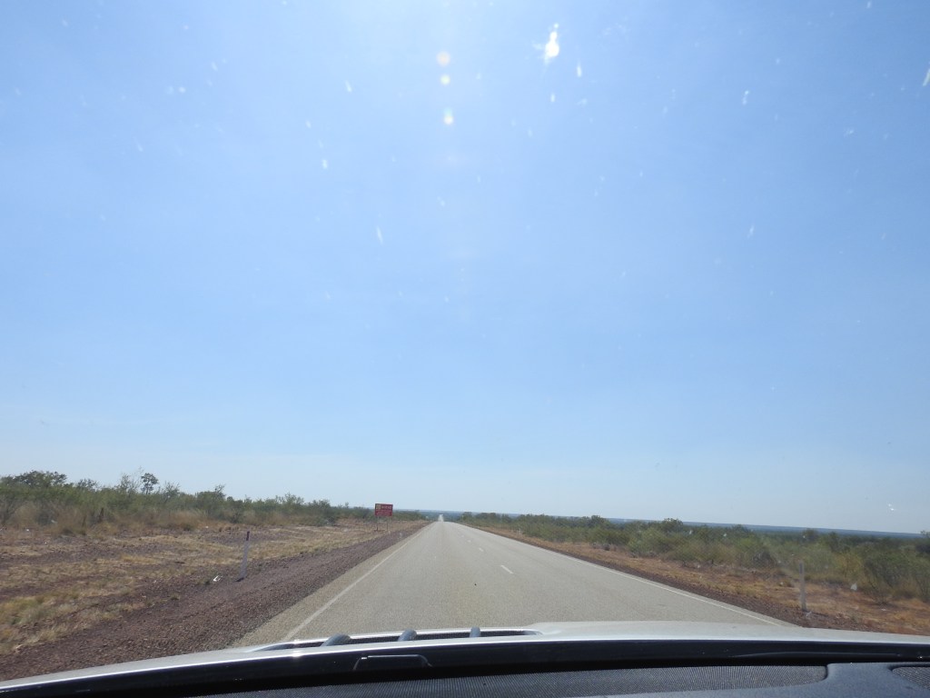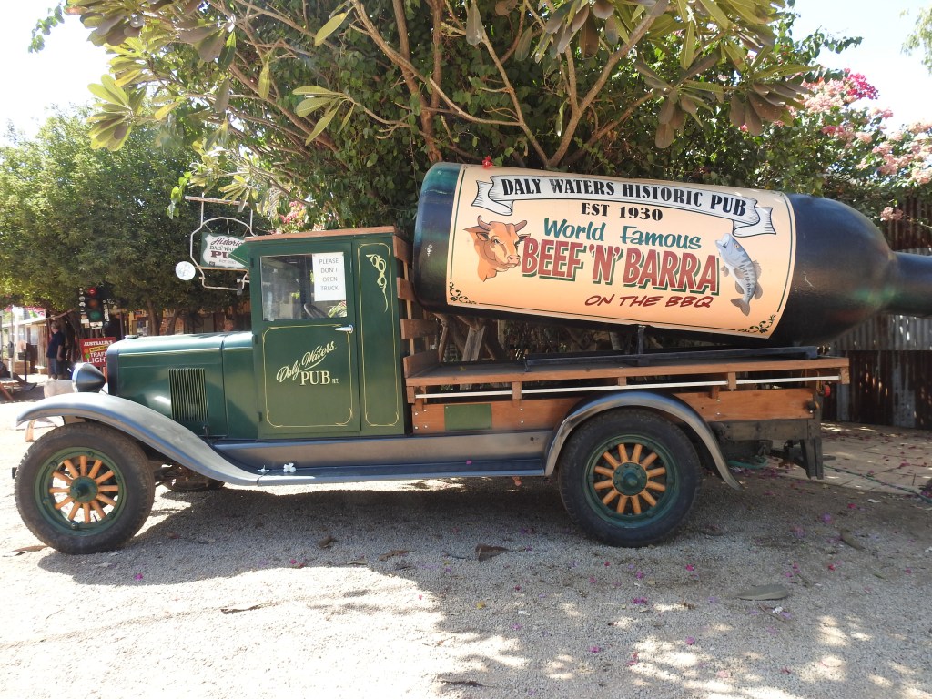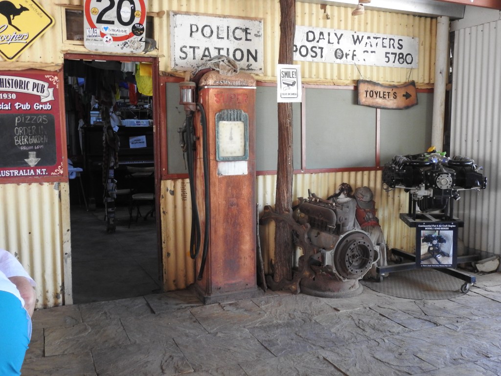 We know it is getting to be daybreak as the traffic starts again on the highway. The morning is very pleasant and after breakfast in the bush we are once again on the road before 9am. It is only an hour drive to the Three Ways (the intersection of the Barkly Highway from Queensland and the Stuart Highway between Adelaide and Darwin) and we turn right to Darwin. The scenery is more of the same, termite mounds, grasses, small trees and shrubs. Lots of termite mounds at the side of the road are dressed in shirts, singlets, hats, sunglasses and anything in between. It helps relieve the boredom of the drive a little. We stop at Elliot, a small town, to refuel and also to eat, however, they were only selling groceries & food to the locals. We decided to keep going for another 140Kms (first place that you could buy anything) and stopped at Daly Waters for lunch at around 1.30pm. The pub and surrounds are very eclectic and busy, the caravan park is full. The pub is very old fashioned and across the road are a collection of old plane and helicopter fuselages. The pub is very busy as well, people coming and going all the time. We both have a barramundi burger for lunch, tasty and very filling. The temperature is 37, good thing the car is air-conditioned.