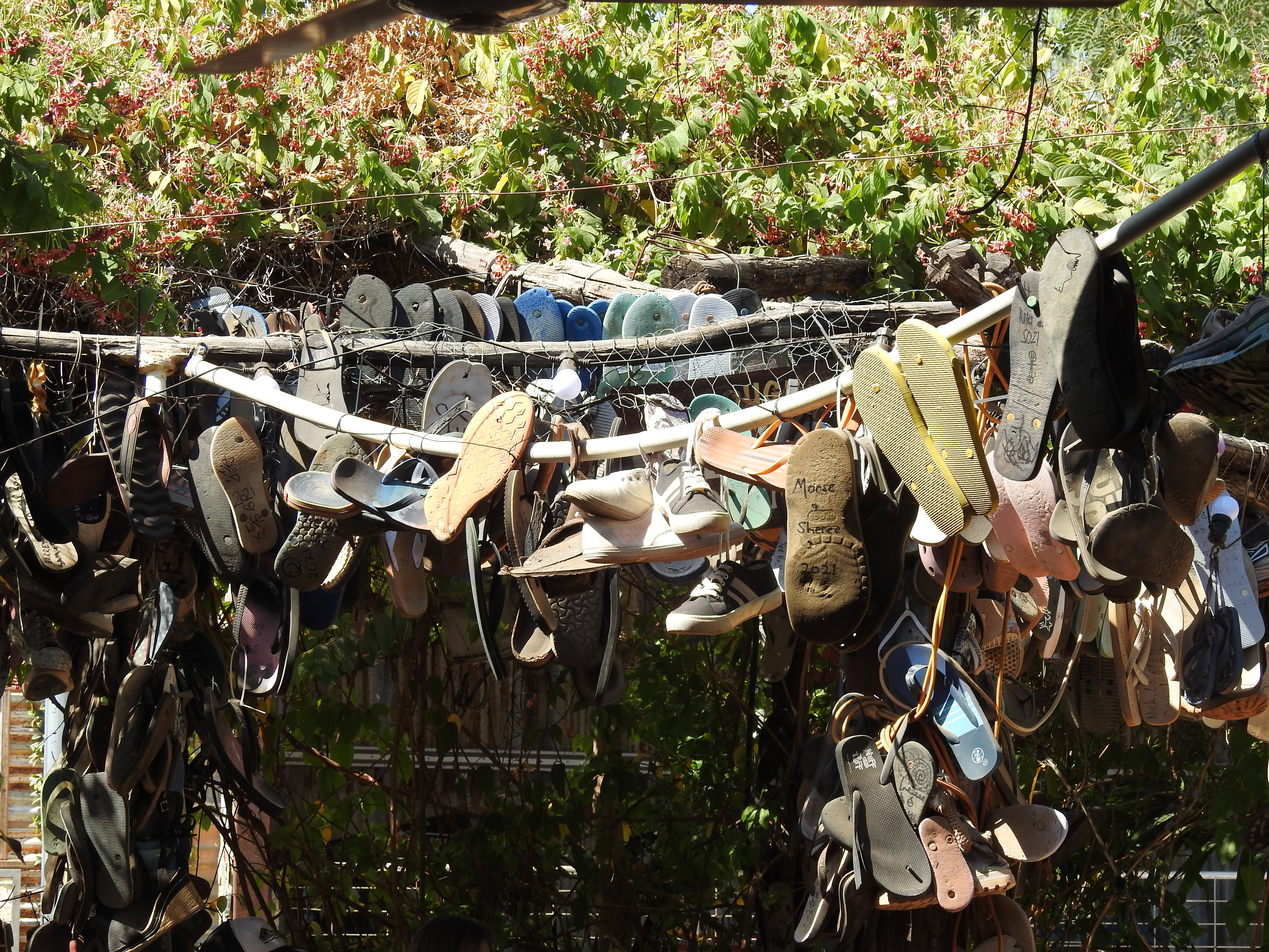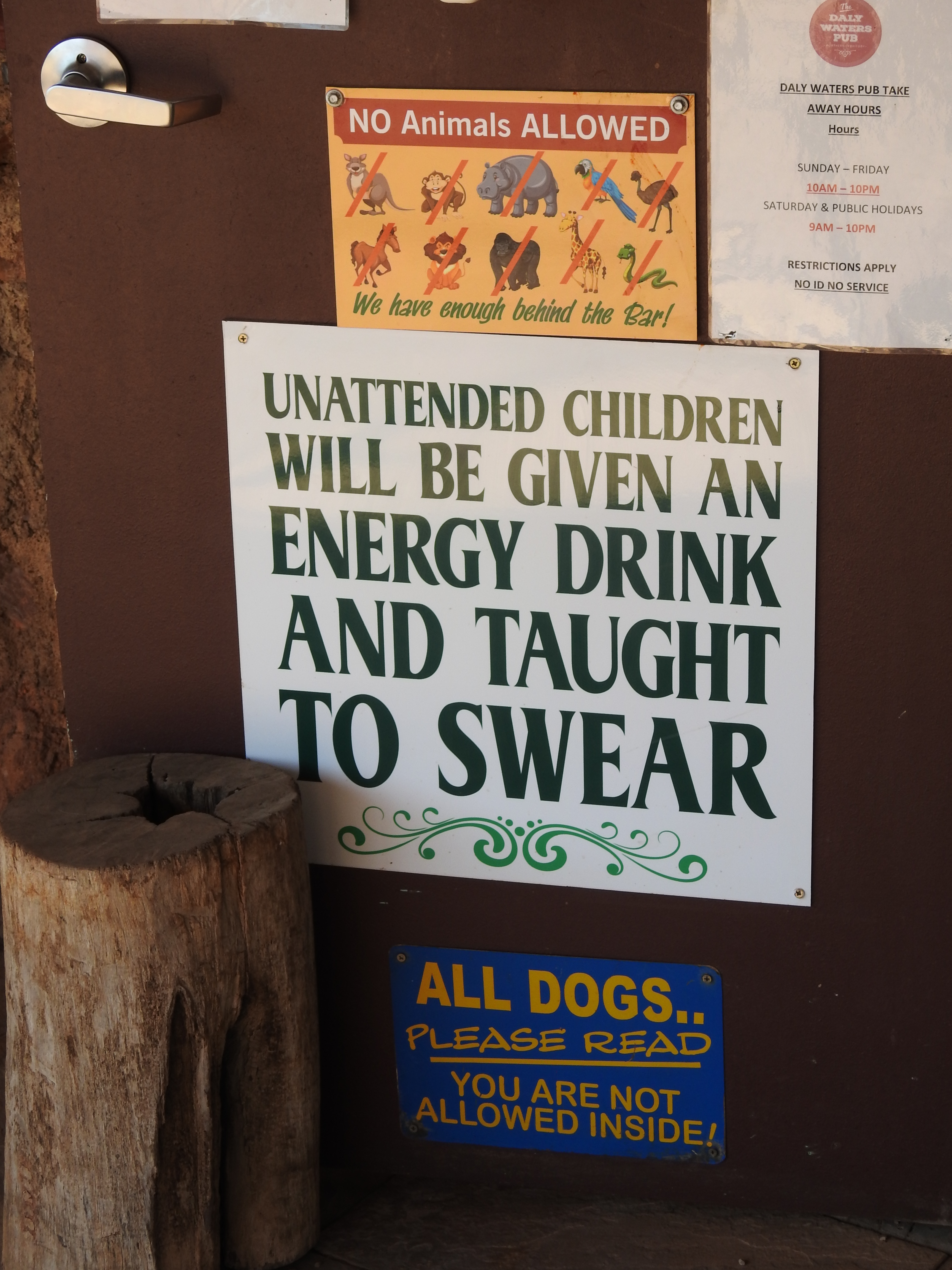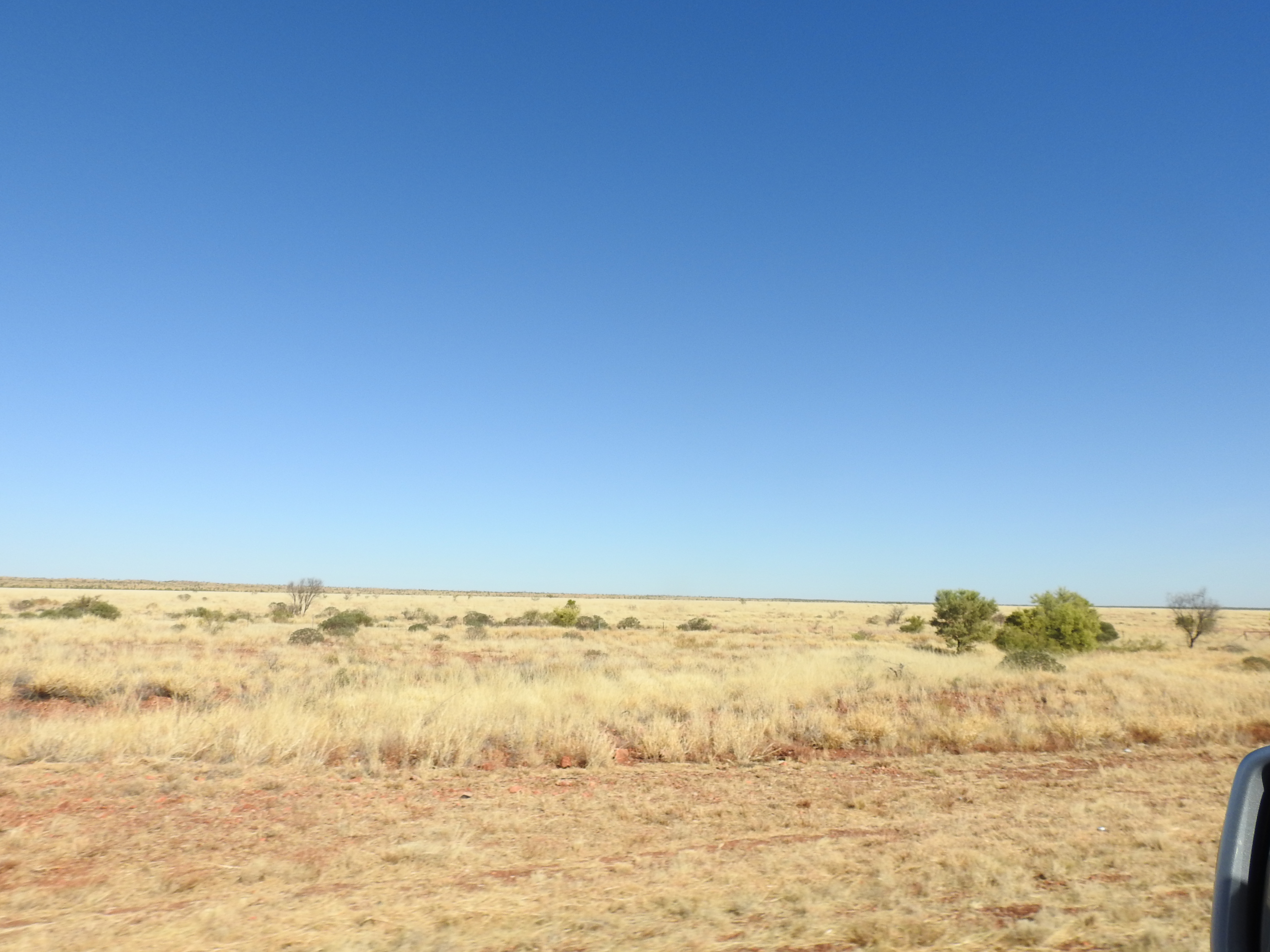 We know it is getting to be daybreak as the traffic starts again on the highway. The morning is very pleasant and after breakfast in the bush we are once again on the road before 9am. It is only an hour drive to the Three Ways (the intersection of the Barkly Highway from Queensland and the Stuart Highway between Adelaide and Darwin) and we turn right to Darwin. The scenery is more of the same, termite mounds, grasses, small trees and shrubs. Lots of termite mounds at the side of the road are dressed in shirts, singlets, hats, sunglasses and anything in between. It helps relieve the boredom of the drive a little. We stop at Elliot, a small town, to refuel and also to eat, however, they were only selling groceries & food to the locals. We decided to keep going for another 140Kms (first place that you could buy anything) and stopped at Daly Waters for lunch at around 1.30pm. The pub and surrounds are very eclectic and busy, the caravan park is full. The pub is very old fashioned and across the road are a collection of old plane and helicopter fuselages. The pub is very busy as well, people coming and going all the time. We both have a barramundi burger for lunch, tasty and very filling. The temperature is 37, good thing the car is air-conditioned.