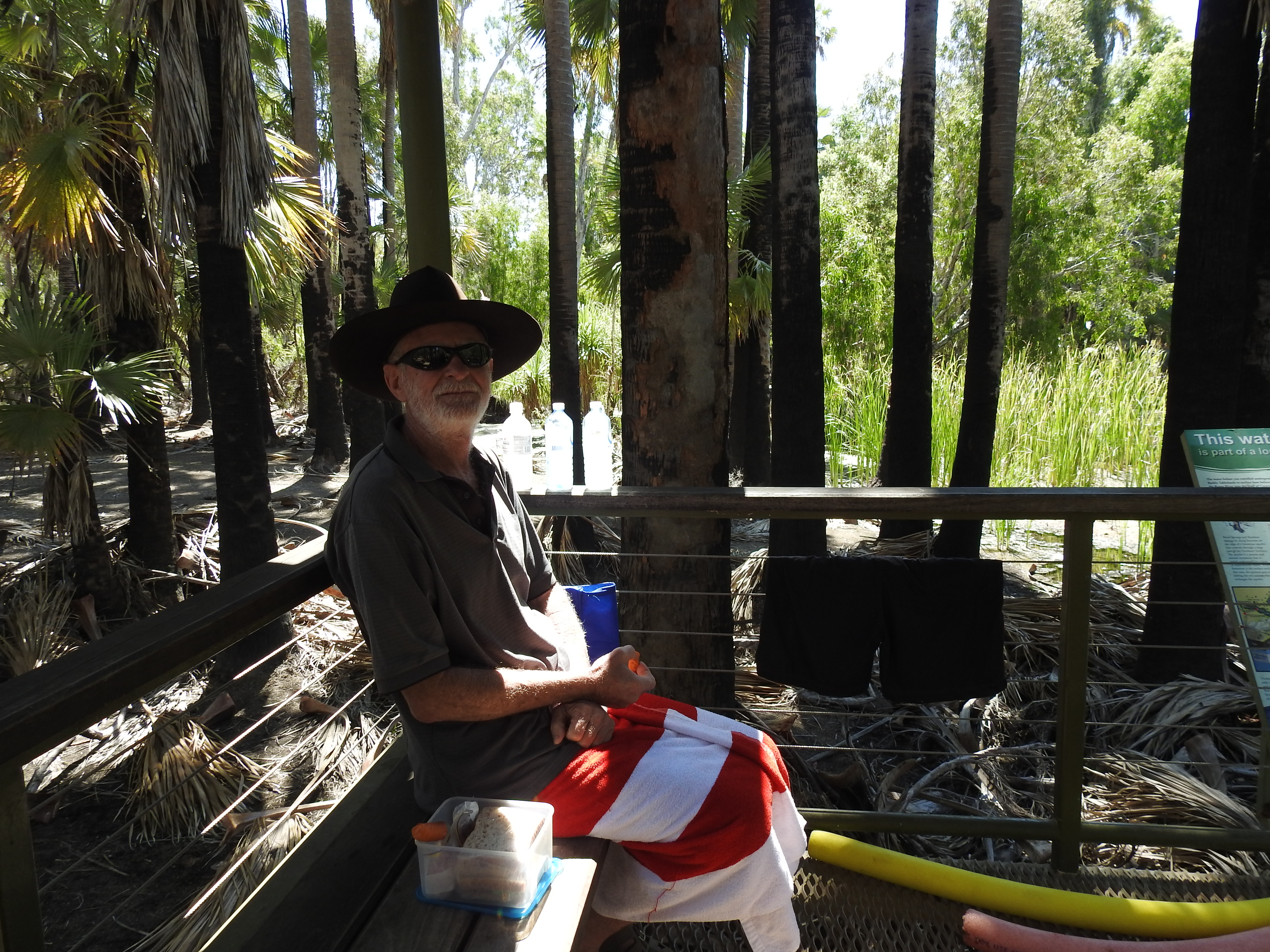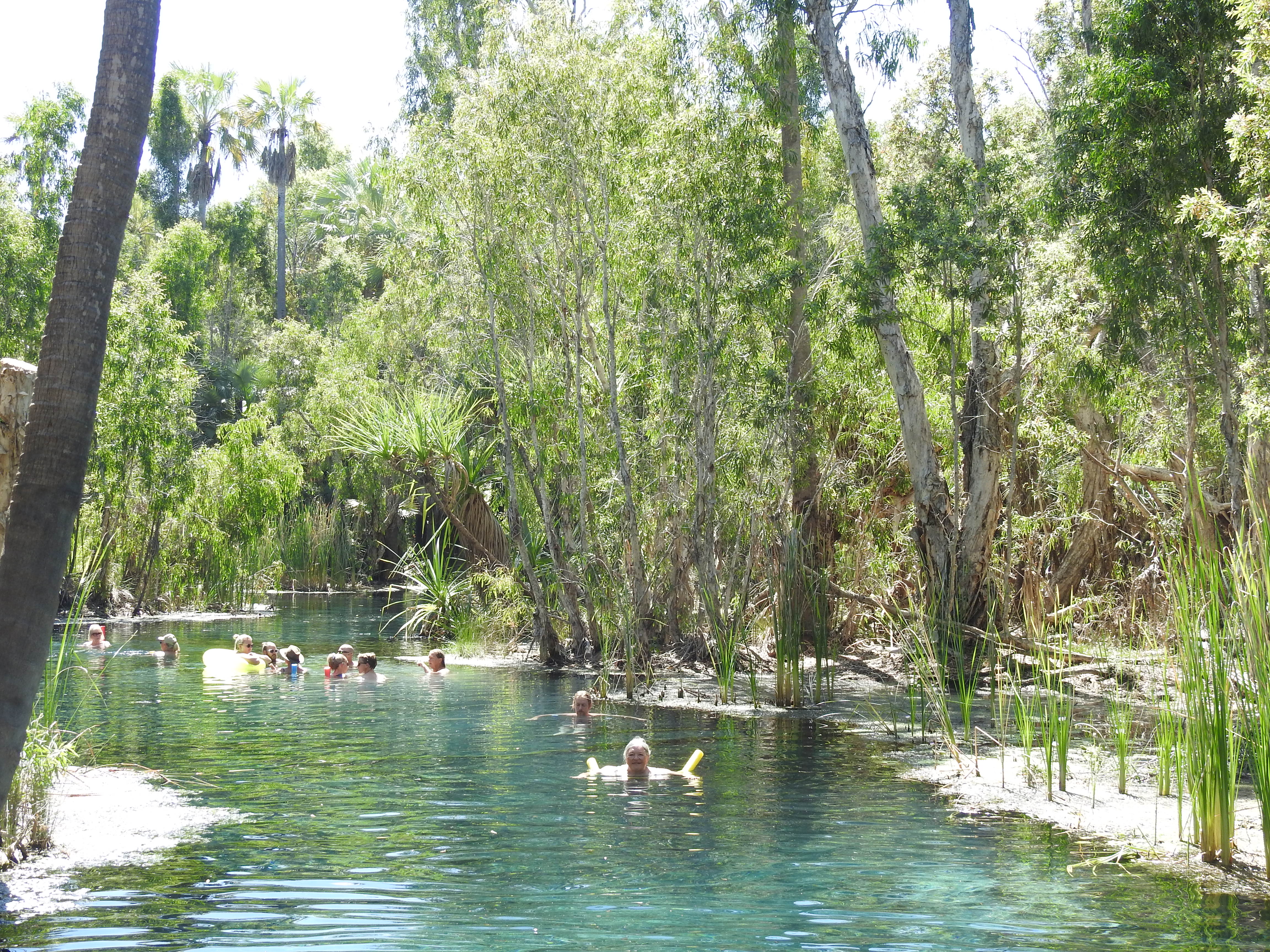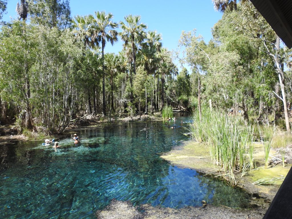 Our next stop is at Mataranka, around 90km down the road. We turn in towards Bitter Springs and are relieved to find that the National Park gates are open this time, the crocodile must have been caught. Bitter Springs are absolutely beautiful, the water is crystal clear and in the natural setting, with trees all round. The water is amazingly nice to swim in, 34C and again we chat to fellow travellers. One couple were from Chile, she had a Hungarian father. Another couple, he was Finnish & she was Cambodian, but their child had Hungarian god parents, amazing. One lot came from Victoria the other from South Australia. We are meeting up with people from every state & even a few from overseas. Australia is a truly multicultural society. After we got out we felt a little cool. The air temp was 34C, how is that? We sat & had lunch on the elevated pool viewing platform before we hit the road again.