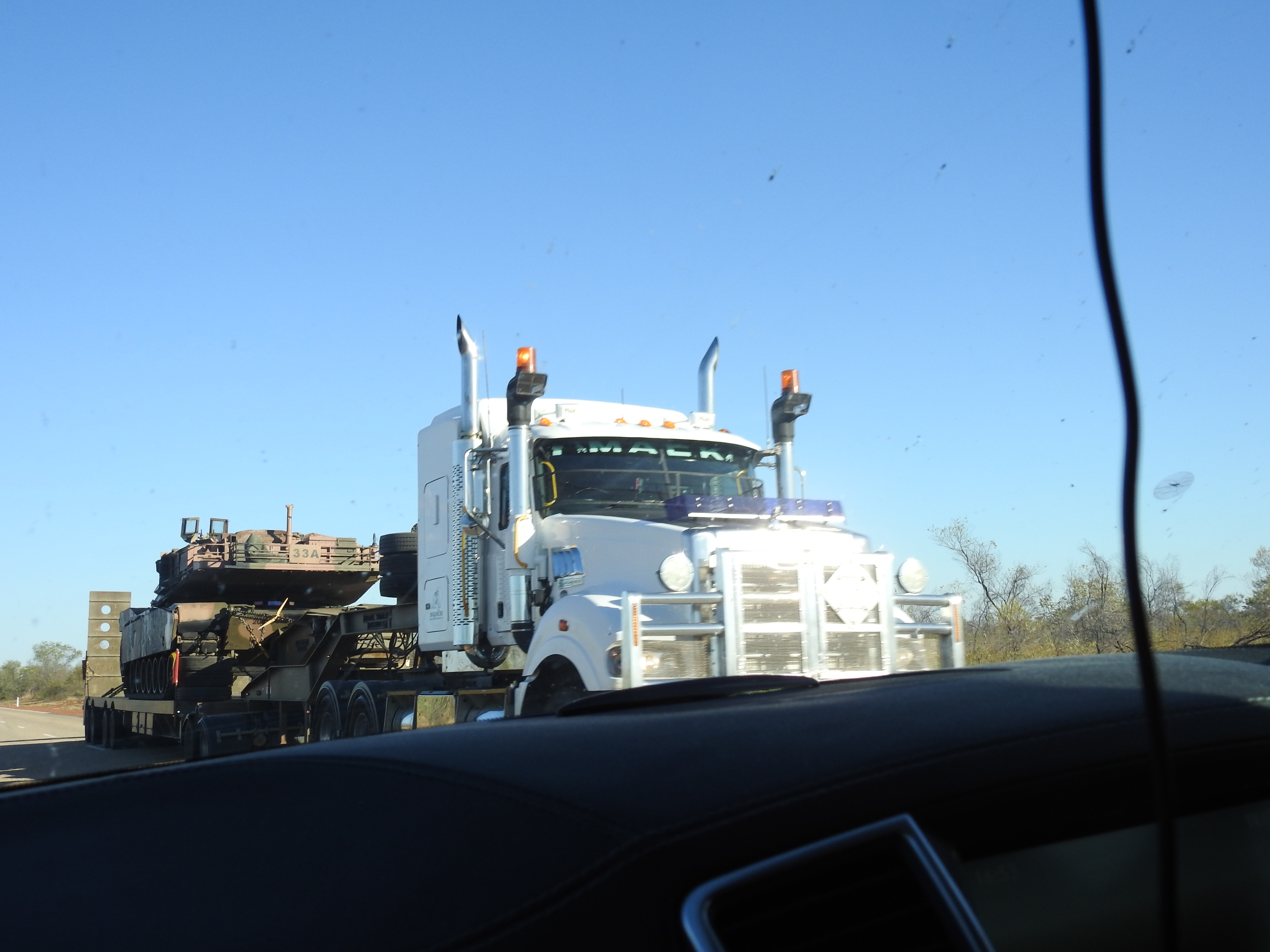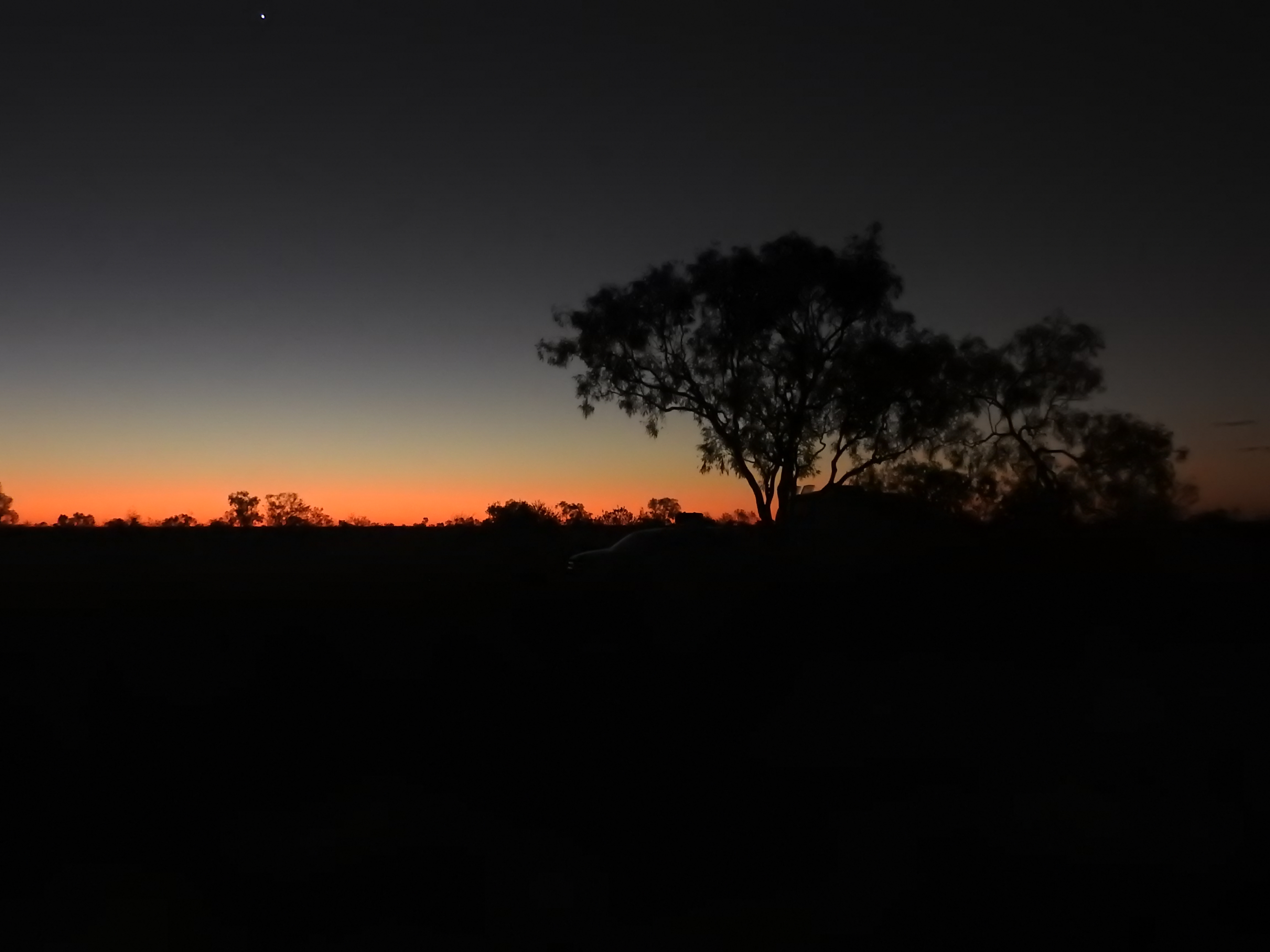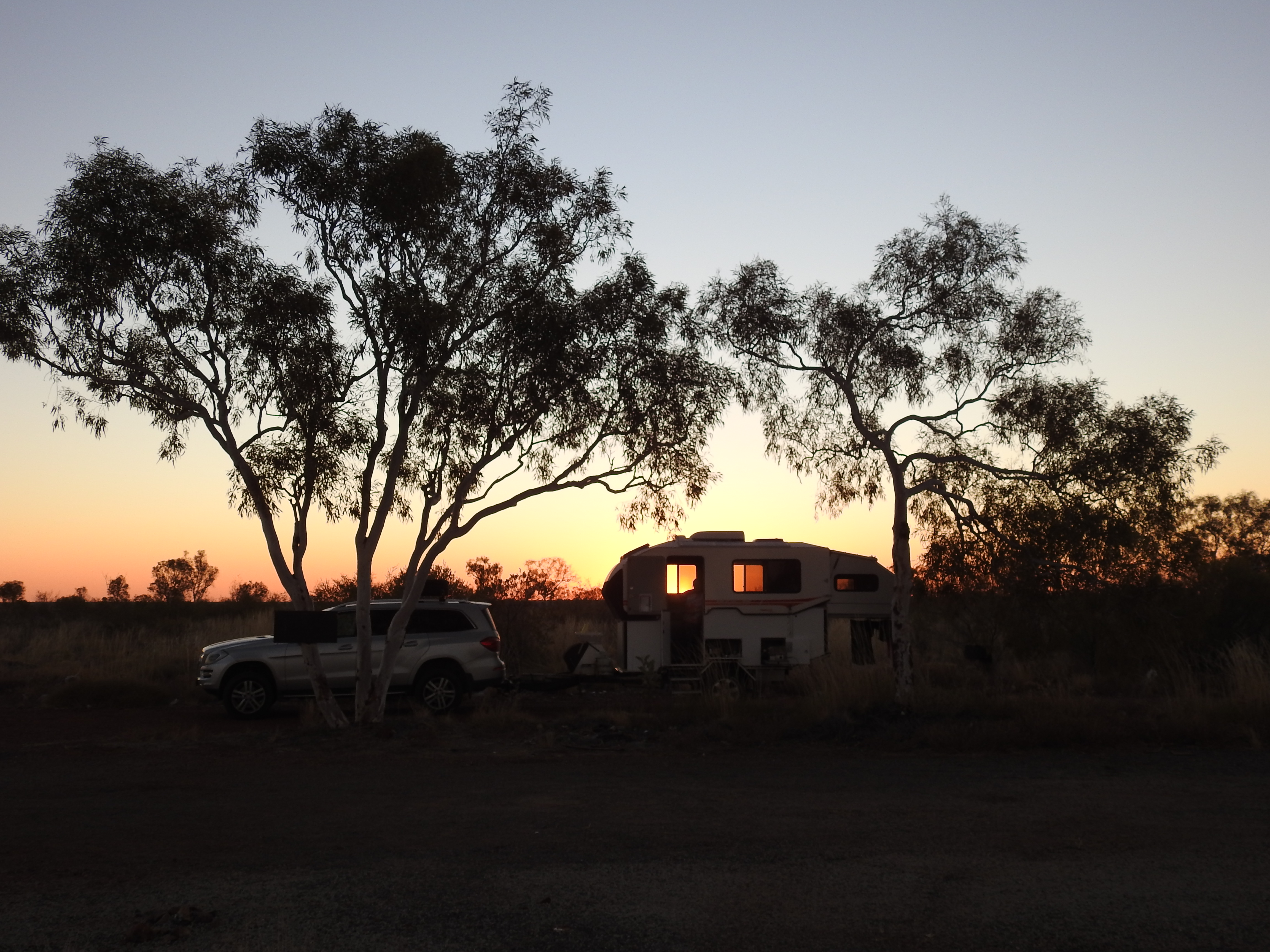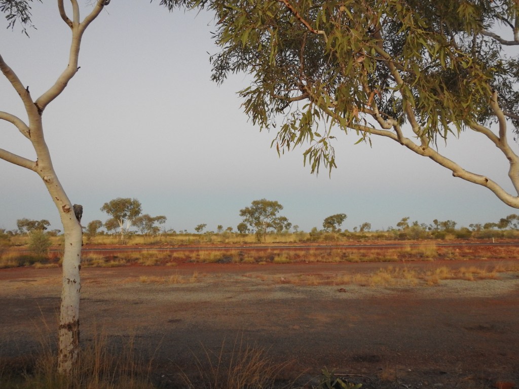 On the road again and we put some distance south, lots of caravans & tourists heading north plus a gaggle of trucks with explosives plus about four or five wide loads carrying army tanks. We stop at Dunmarra for a refuel & a leg stretch. We have a little over half a tank of fuel, but out here, you don’t know where you can get fuel from, so we play it safe and make sure we are carrying plenty of fuel. We keep driving past Elliot and towards Renner Springs when the shadows start to lengthen and we look for somewhere to pull over for the night. We find an old road works area & pull in there, no-one else around. We pull in as far off the road as we can & tuck in behind some trees.