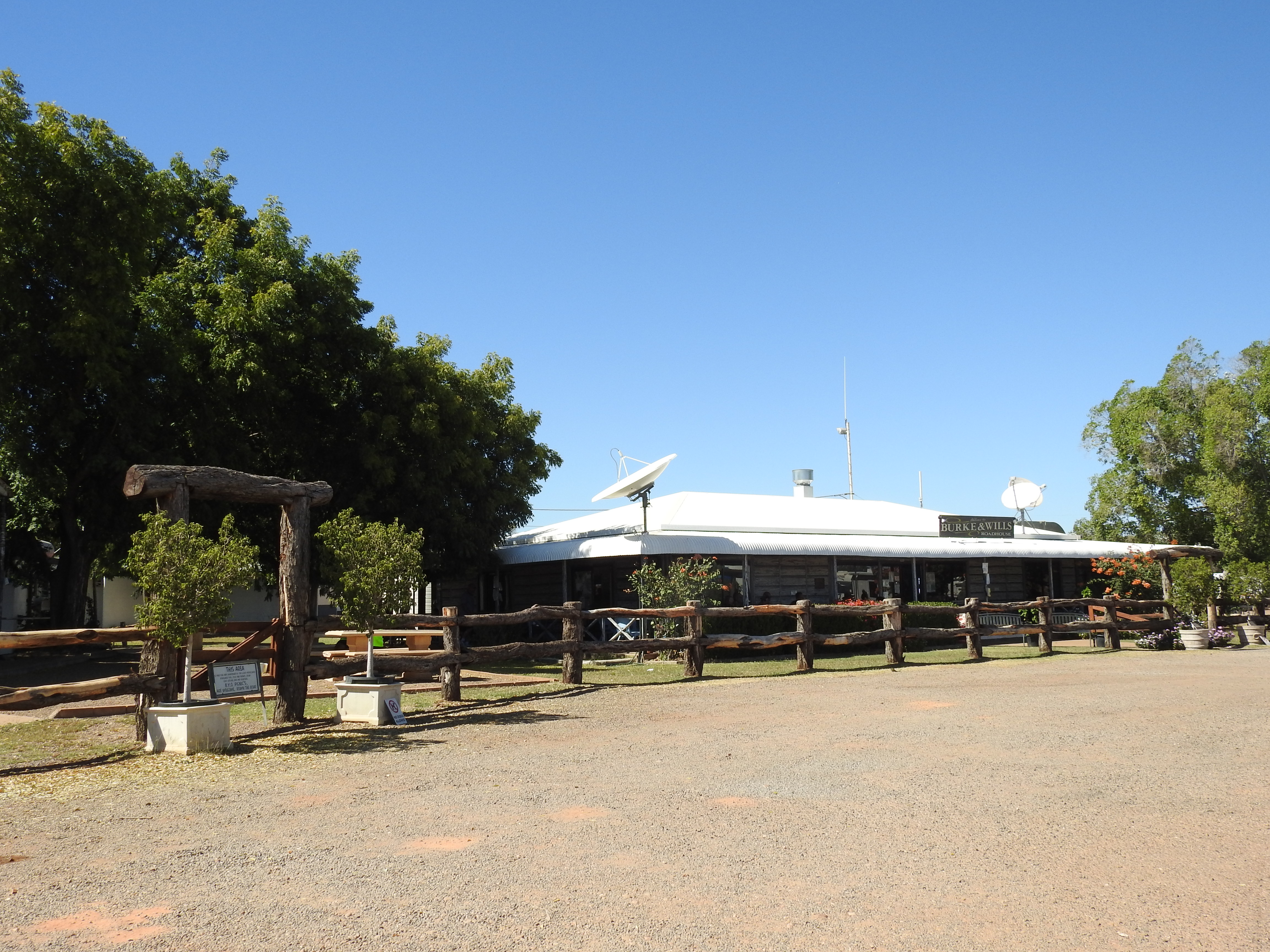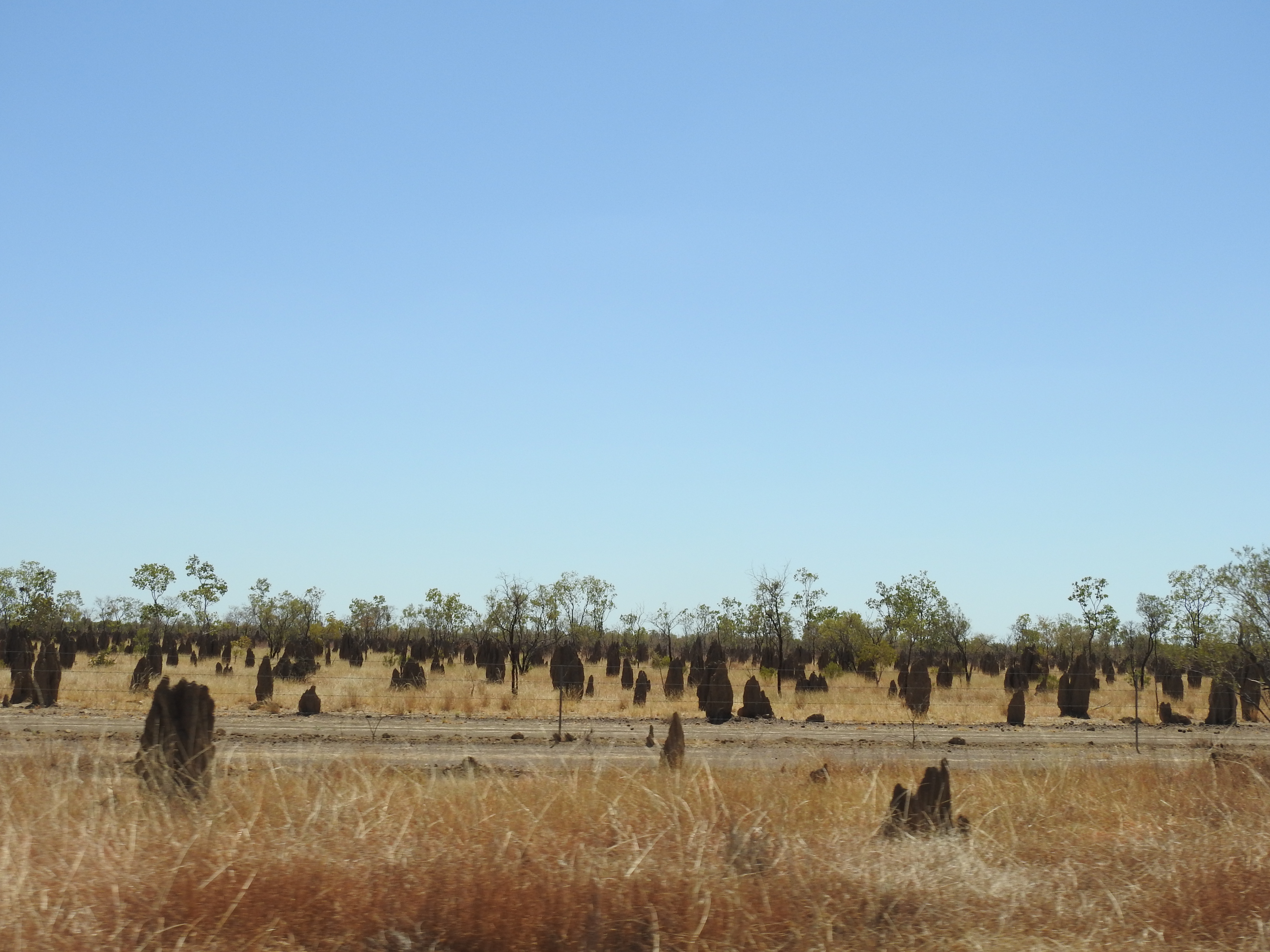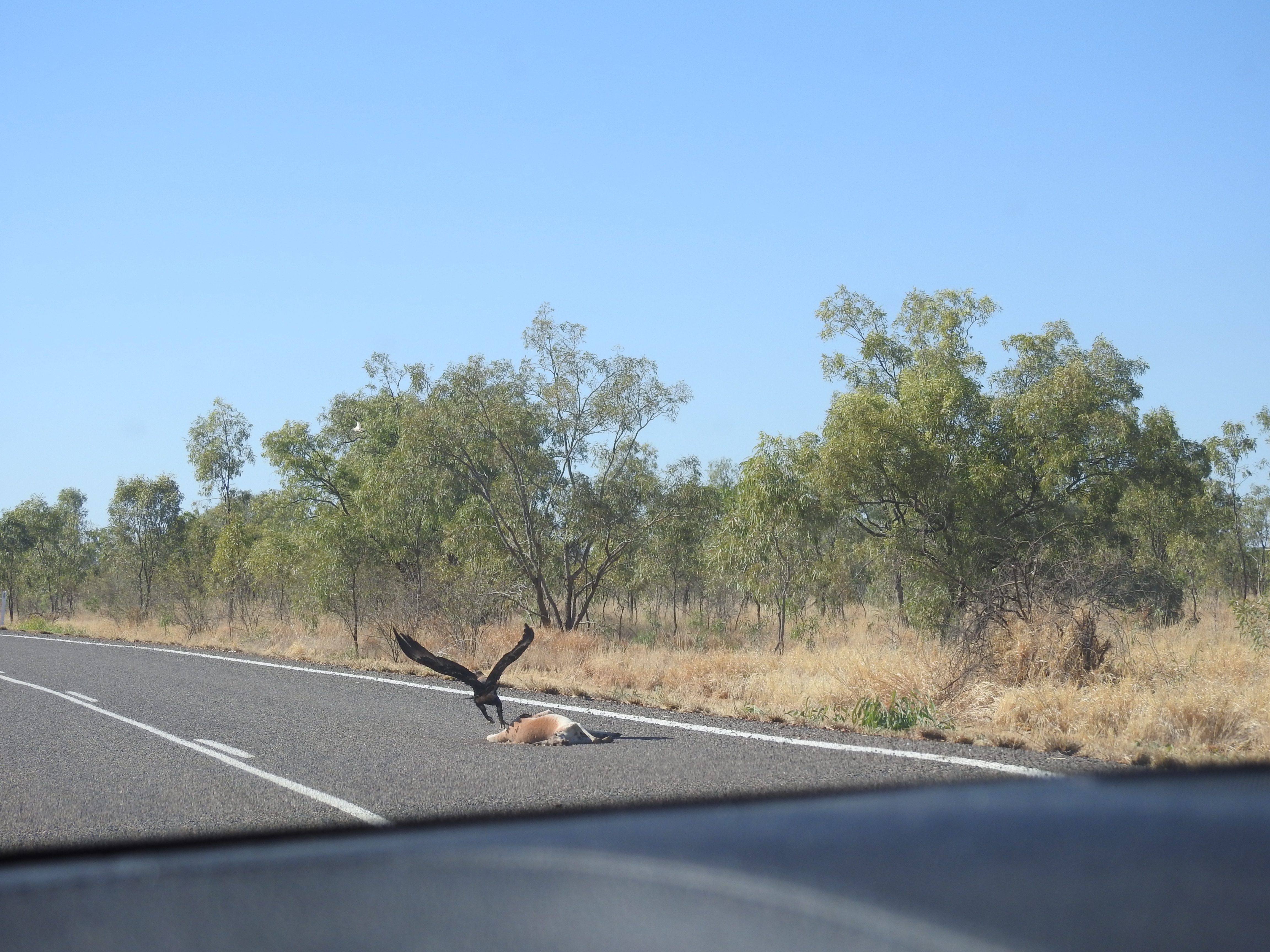 Sunrise start again and we tried to be quite as the other campers were still asleep. This is a very nice camping spot, right on the river, lots of trees, lots of birds. The road out is very rough climbing out of the river banks on a rough dirt track, we wind the car up to full height and slowly climb out. Back to Gregory then turn right and off to the Burke & Wills roadhouse on the way to Normanton & Karumba. There are lots of dead wallabies and kangaroos on the side of the road plus lots of kites feeding on them plus a few wedge tail eagles on the carcase. Termite mounds by the thousands on the side of the road are a feature of the drive. We refuel at Burke & Wills plus have a burger for an early lunch, this place is so busy, lots of caravans and camper vans doing the same and heading in all different directions.