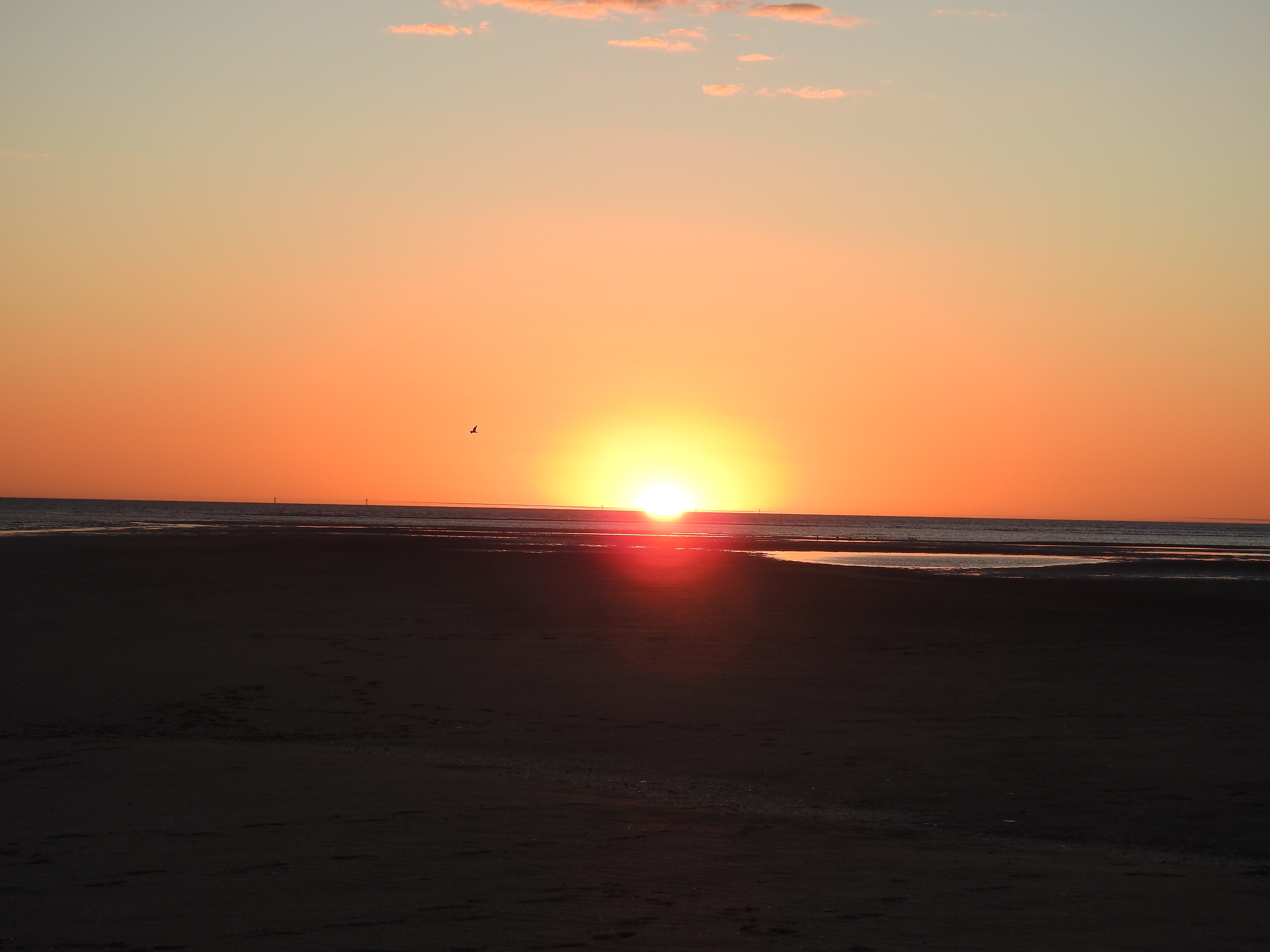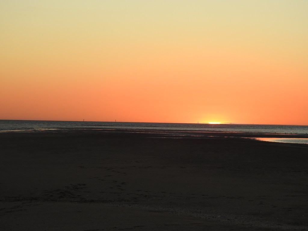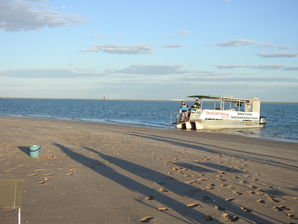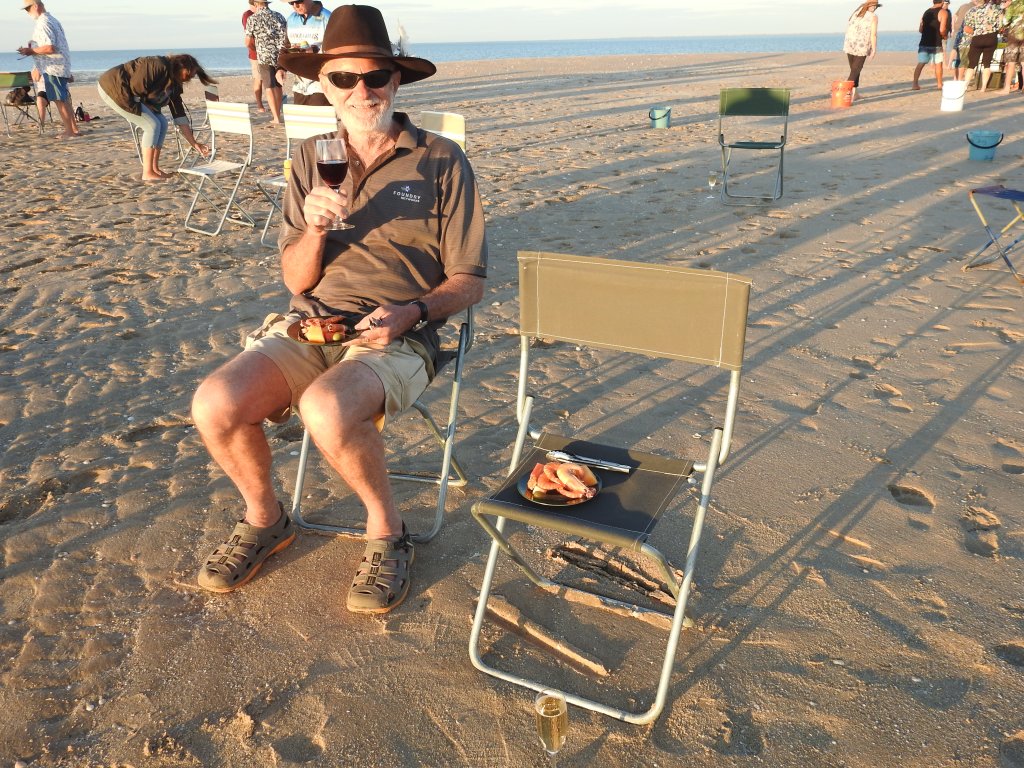 The boat heads up the river past the port and the boat guide explains all the details of the different wharf facilities plus the areas used by flying boats, both Qantas & the 2nd world war. The boat then turns & head down river and out to sea. Seven km later a low tide sand cay appears and we stop and nose into the sand. We are each given a fold up chair & explore the sand & collect a few unusual shaped shells. The crew set up some tables and lay out nibblies & cold cooked king & banana prawns plus champagne, wines and cold beers. We sit & watch the sun set over the Gulf of Carpentaria, paradise.