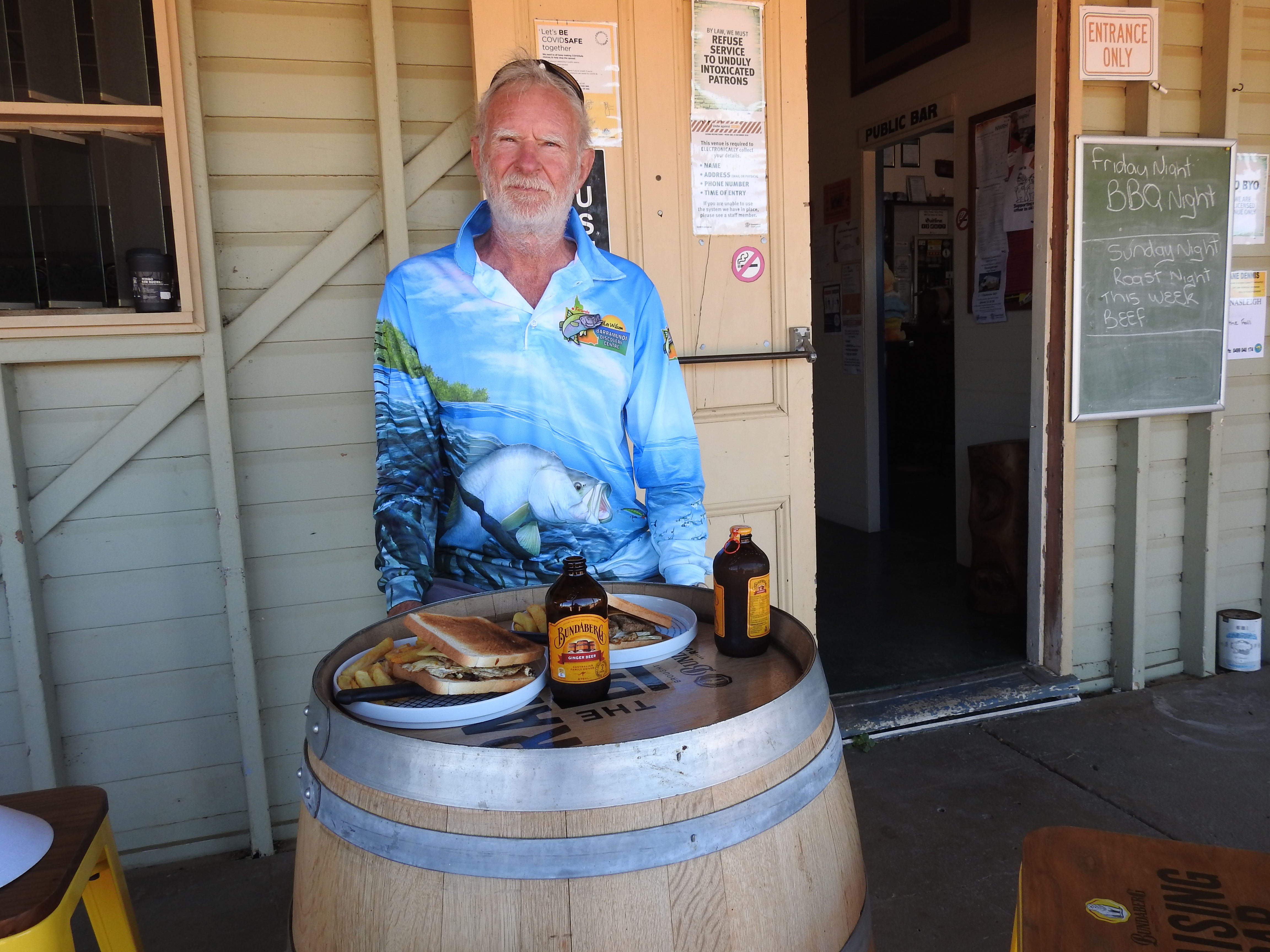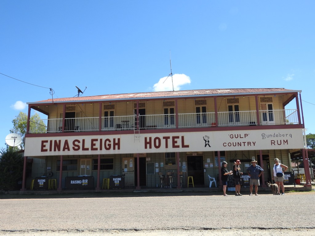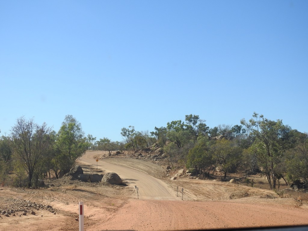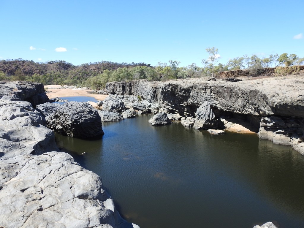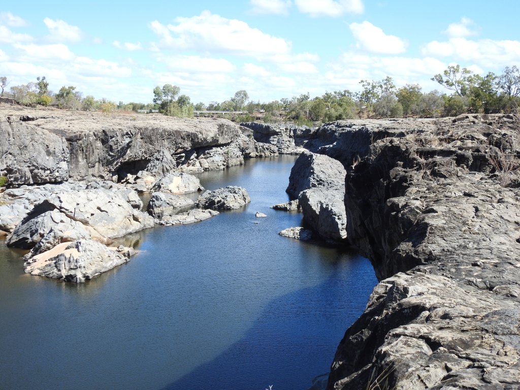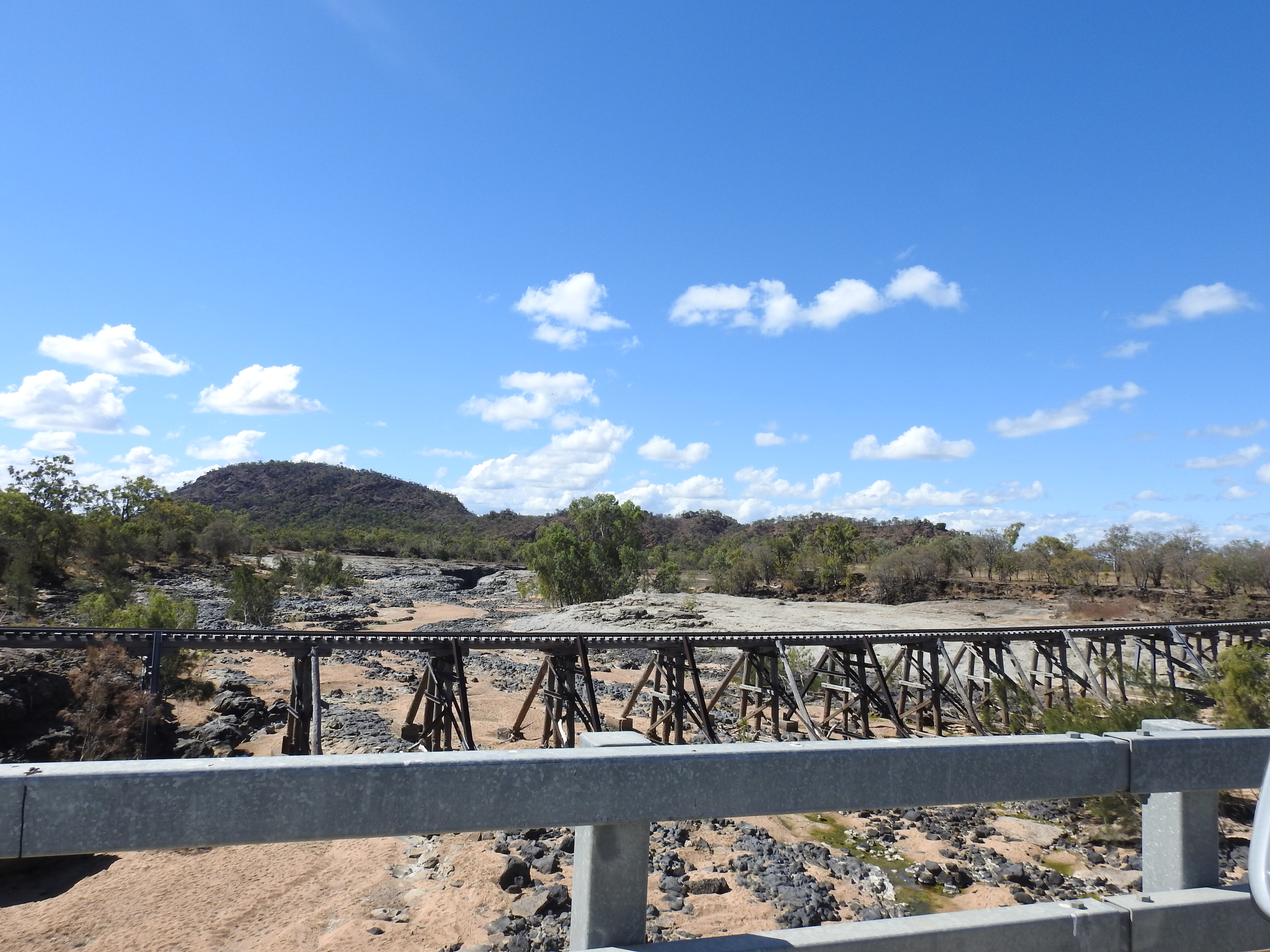 Next we take a drive to another old gold town, Einasleigh on the Copperfield River that is around 54km away, mostly bitumen, with about 8km of good dirt. This place is even smaller than Forsayth and we stop at the old two story pub for a steak sandwich, really tender meat. We chat to a few people at the pub then cross the road to the Copperfield Gorge. This is a small beautiful deep gorge cut out of the river & has a long pool of water the length of the gorge. There is no water flowing in the river so the waterfall at the beginning of the gorge is not flowing. There are a few volcanic plugs standing out nearby that punctuate the scenery and give the view a nice boost.