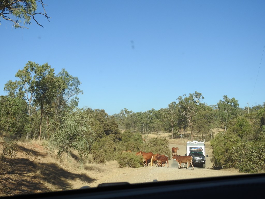 It was really windy during the night and still blowing hard as the sun rose. We packed and let the tyre pressures down. All the people we have spoken to have told us that the road into Cobbold Gorge is pretty rough & corrugated. They were right. The dirt road winds up and down through creek crossings, we do come across a road works team grading & rolling the road, we are thankful for that smooth section. There are lots of cattle grazing, some close to the road, some walking on the road we have to slow right down for. There are lots of vehicles and caravans coming the other way and we get overtaken by two caravans and a car, I am driving very slowly and it takes nearly two hours for us to complete the 48km in.