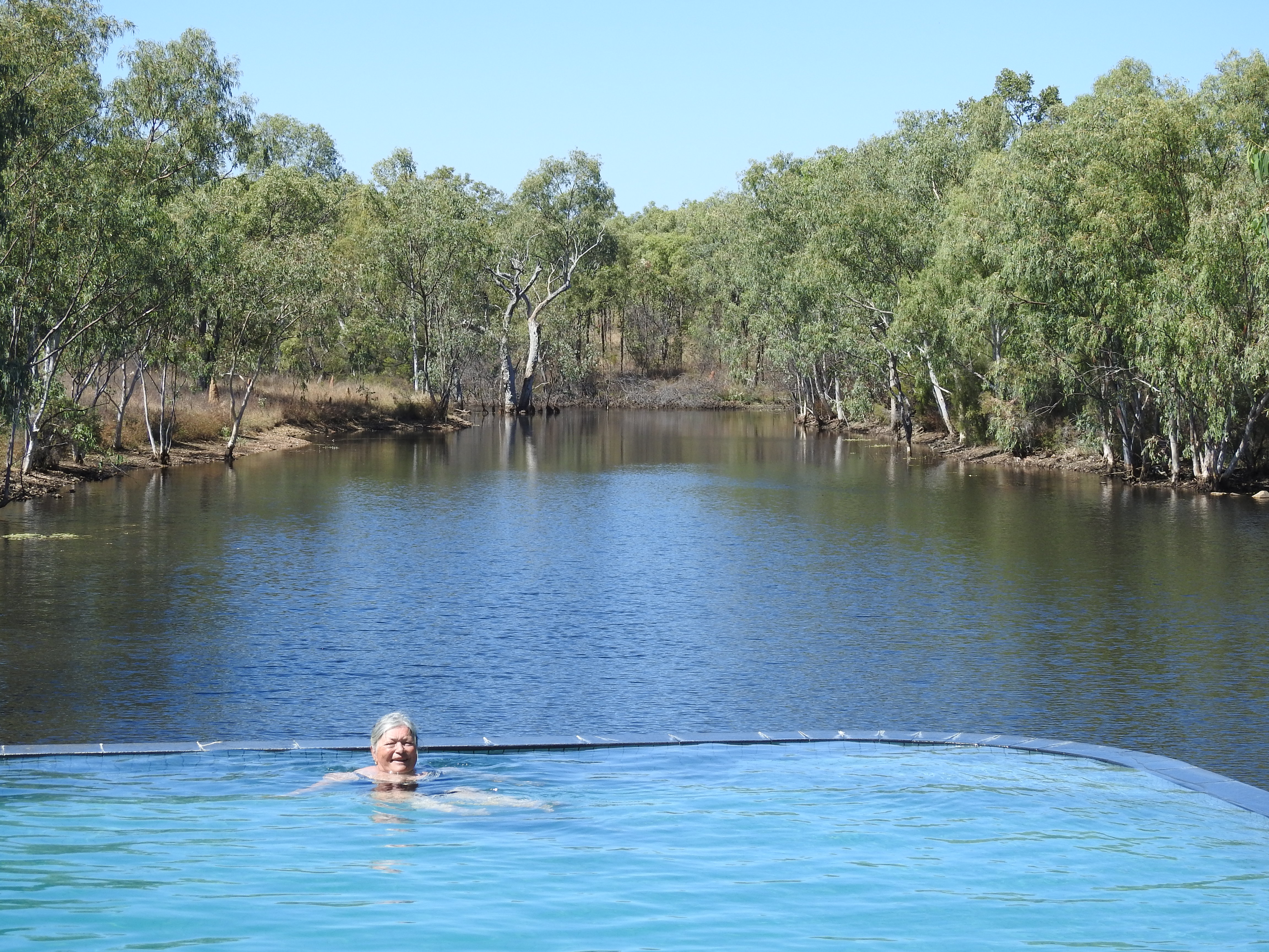 At last the gates of Cobbold Gorge welcome us & we check in to our van spot & set up. Next is a swim in the infinity edge pool looking out over the dam, very nice indeed. We have lunch at our van before heading down to start our Cobbold Gorge tour. There are more than 60 people lined up & we split into five groups & load onto three 4wd buses. The trip to the gorge is about 5km by dirt road & we cross a wide sandy river bed before reaching a really big shed where the buses are parked to provide some shade.