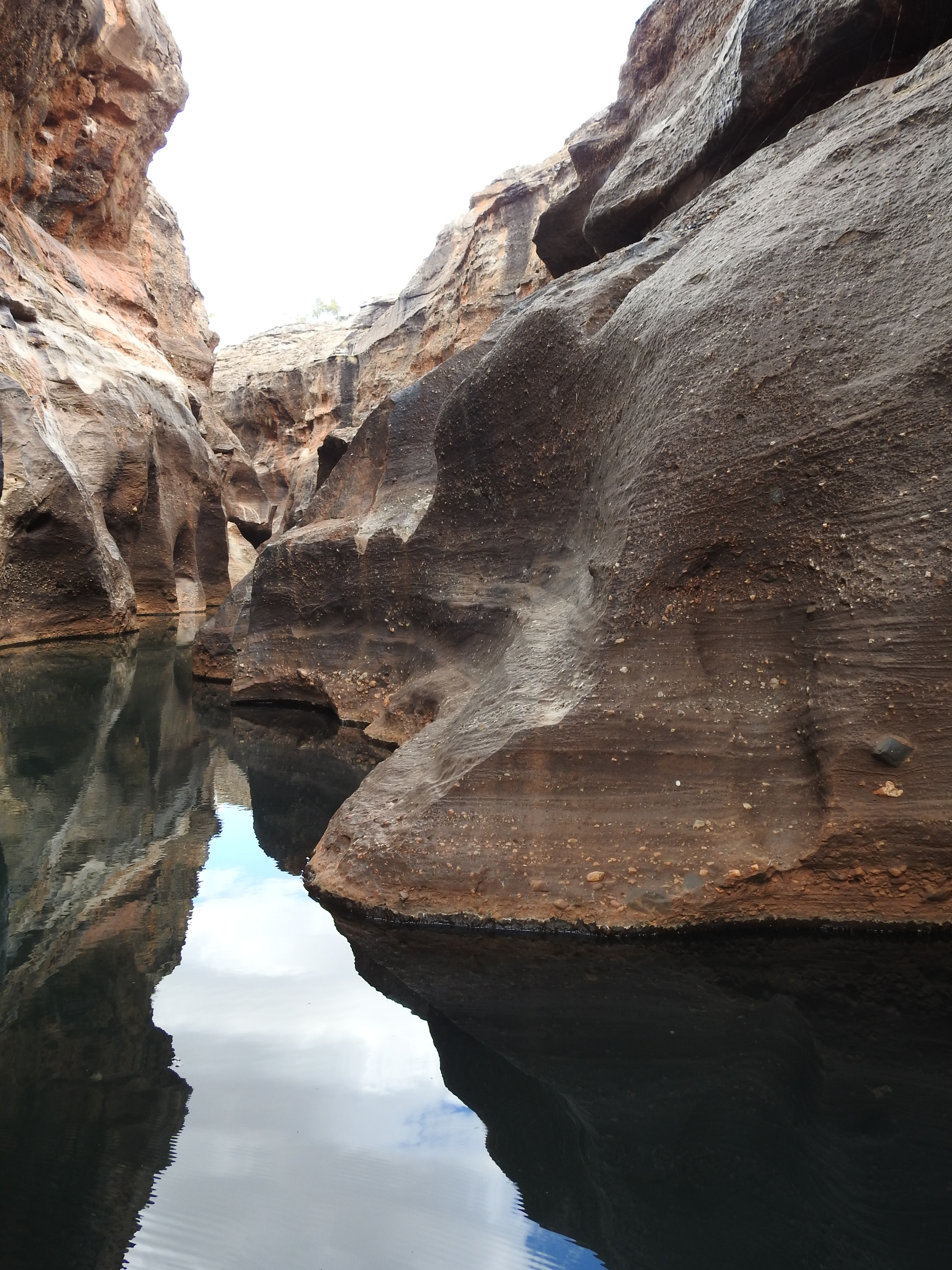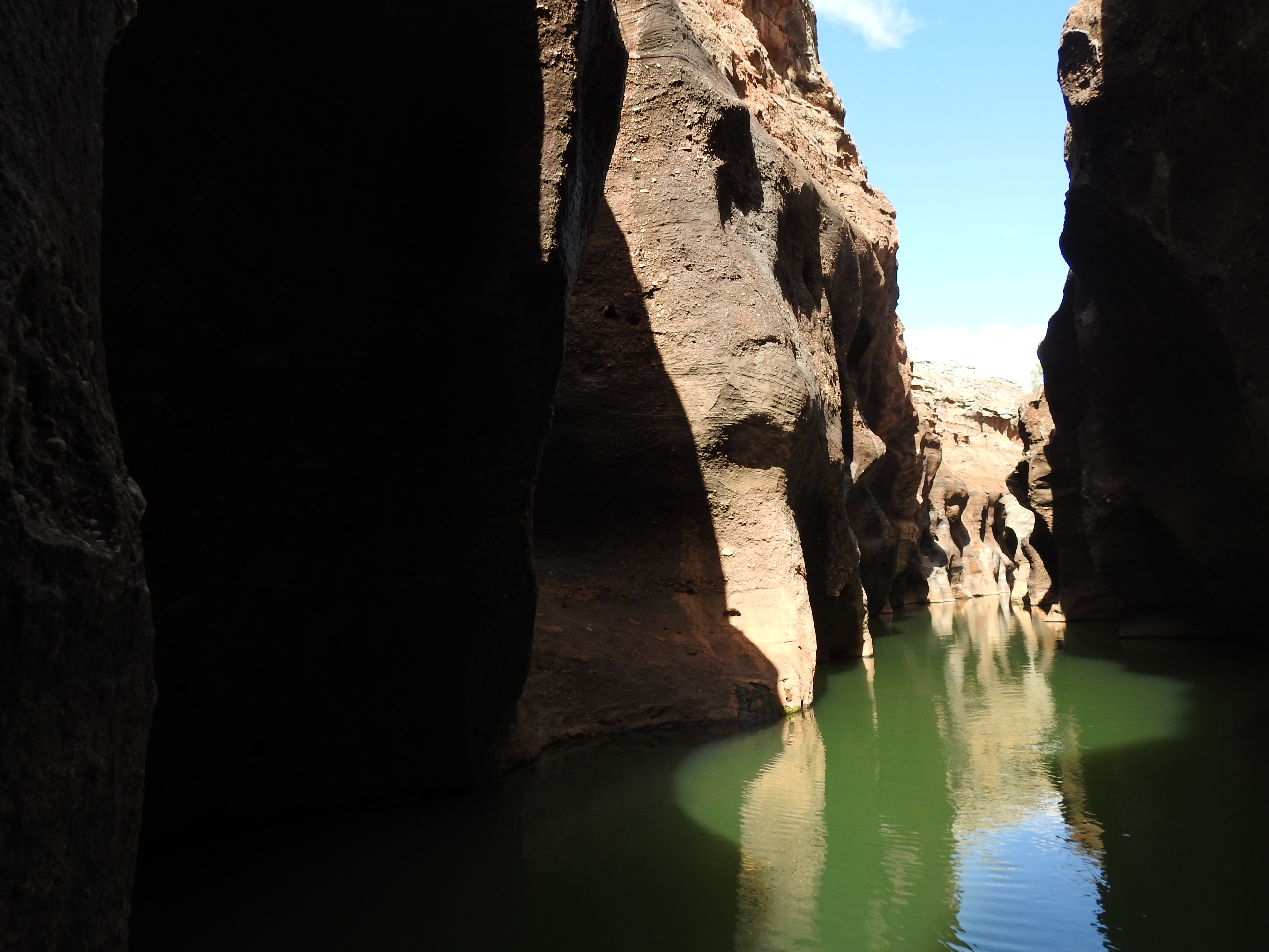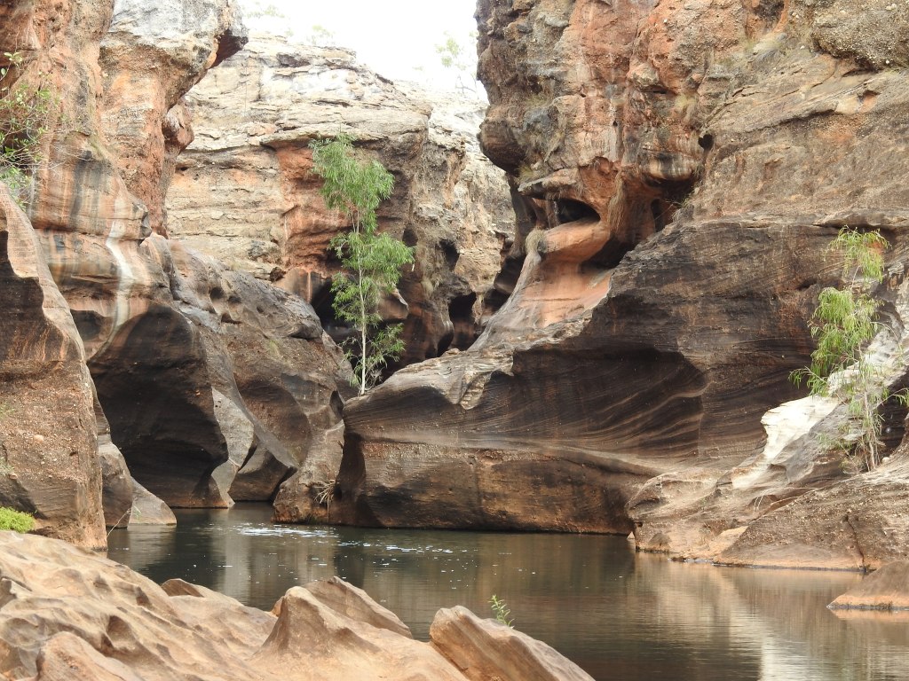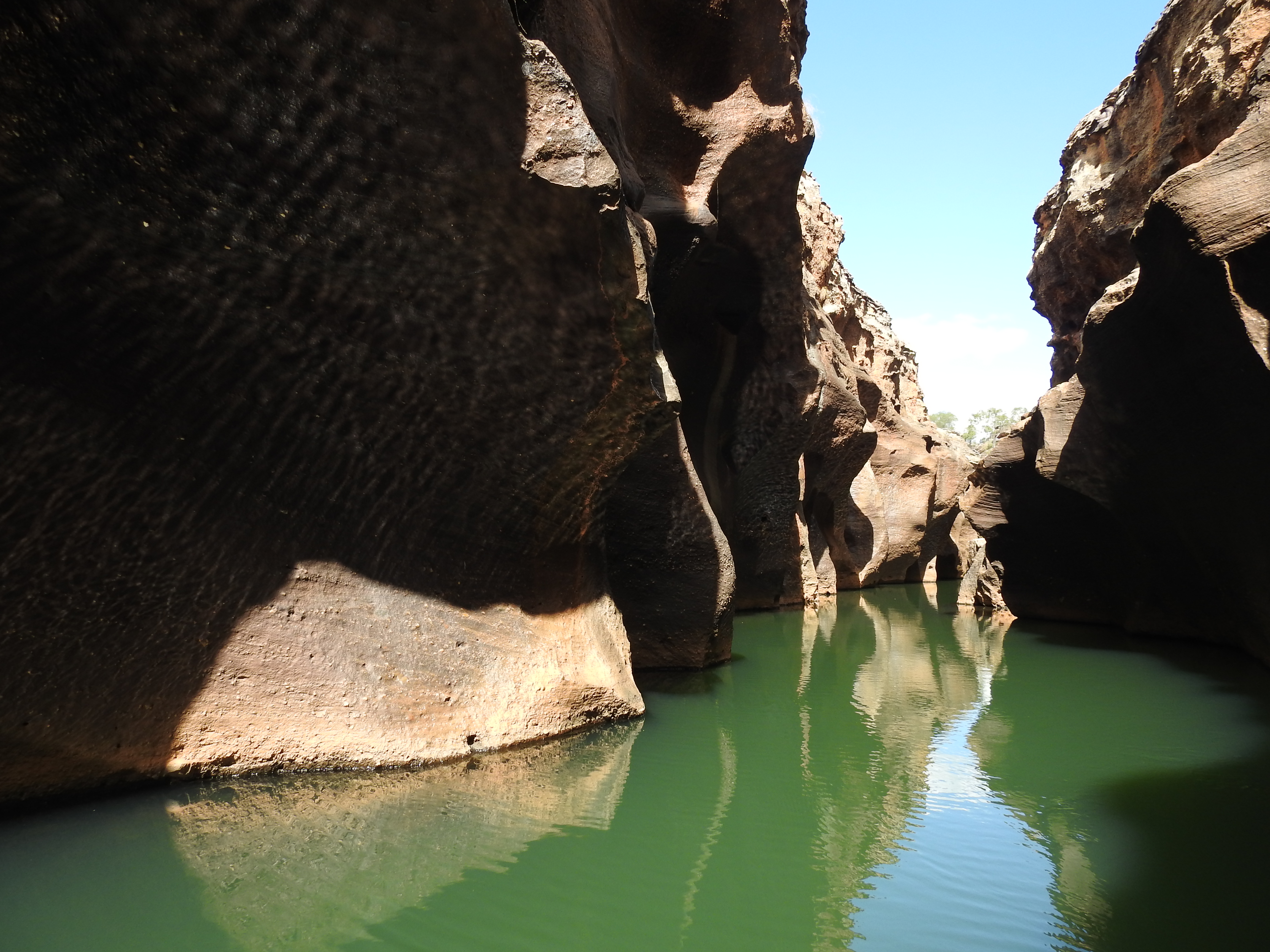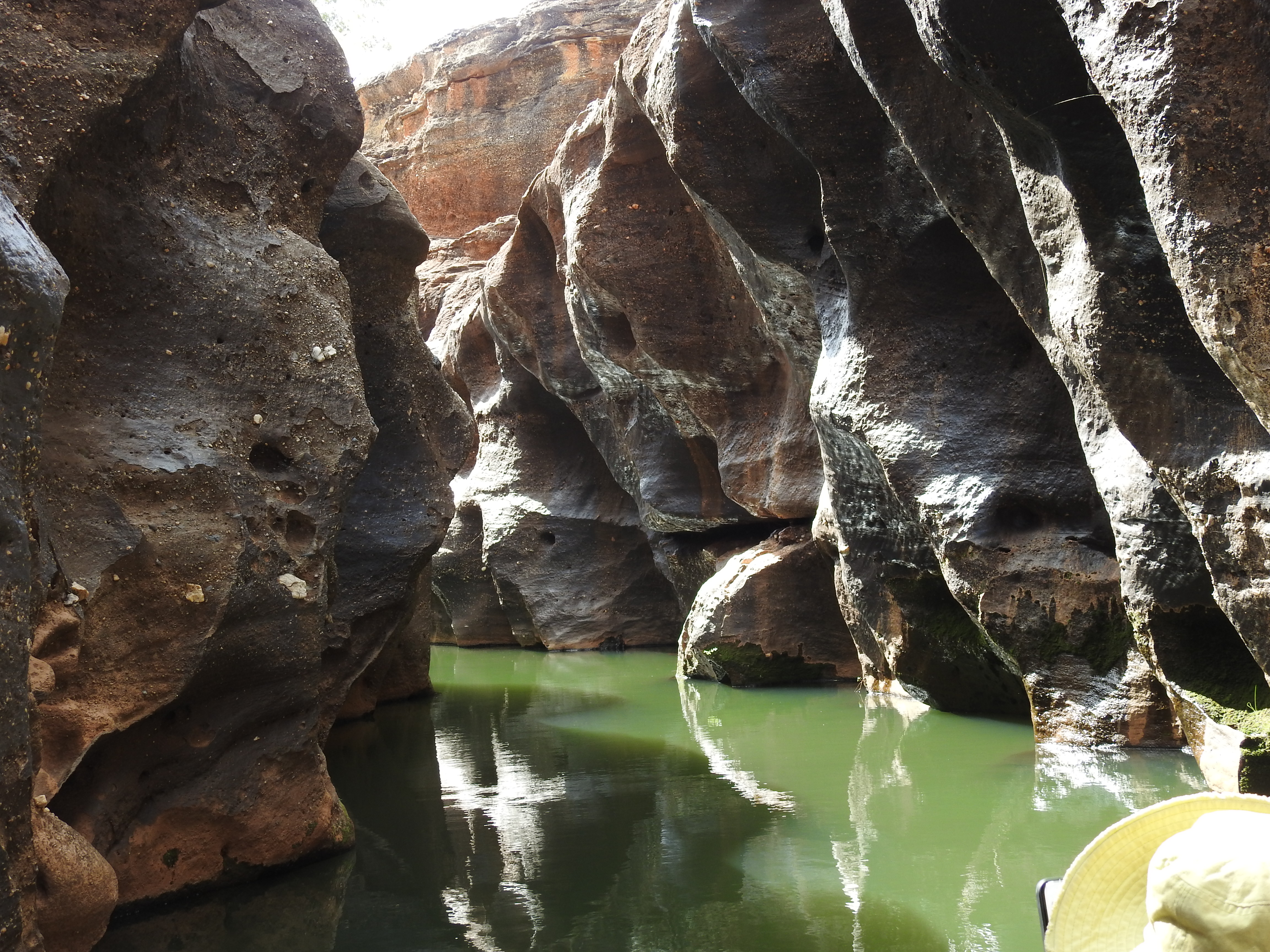 We start with a short talk on the history and then walk a short way to a floating pontoon with some narrow flat bottomed aluminium boats tied up. They have an electric motor on each end of them. Fourteen of us fit snugly on the boat and we need to do a bit of re-balancing to keep the weight distribution even. The electric motors are very quiet and we spot a couple of freshwater crocodiles sunning themselves before we enter the gorge proper. Stunning is the best word to describe it, nature at its best. The gorge is very narrow & gets narrower the further we progress up it. The rock is highly polished in places from the swirling water when the creek is in flood. In some sections there are bands of exposed rounded rocks from the sedimentary layers. There are lots of small fish swimming, but no water birds inside the gorge. The gorge twists and turns & each corner we turn seems more stunning than the last. As we reach the top of the gorge we need to stop & wait for the previous boat to come back out. The 2 boats are very narrow but the gorge is even narrower. We touch rock in lots of places with the boat as we pass through some very narrow sections. The trip back is just as spectacular and we enjoy every twist & turn.